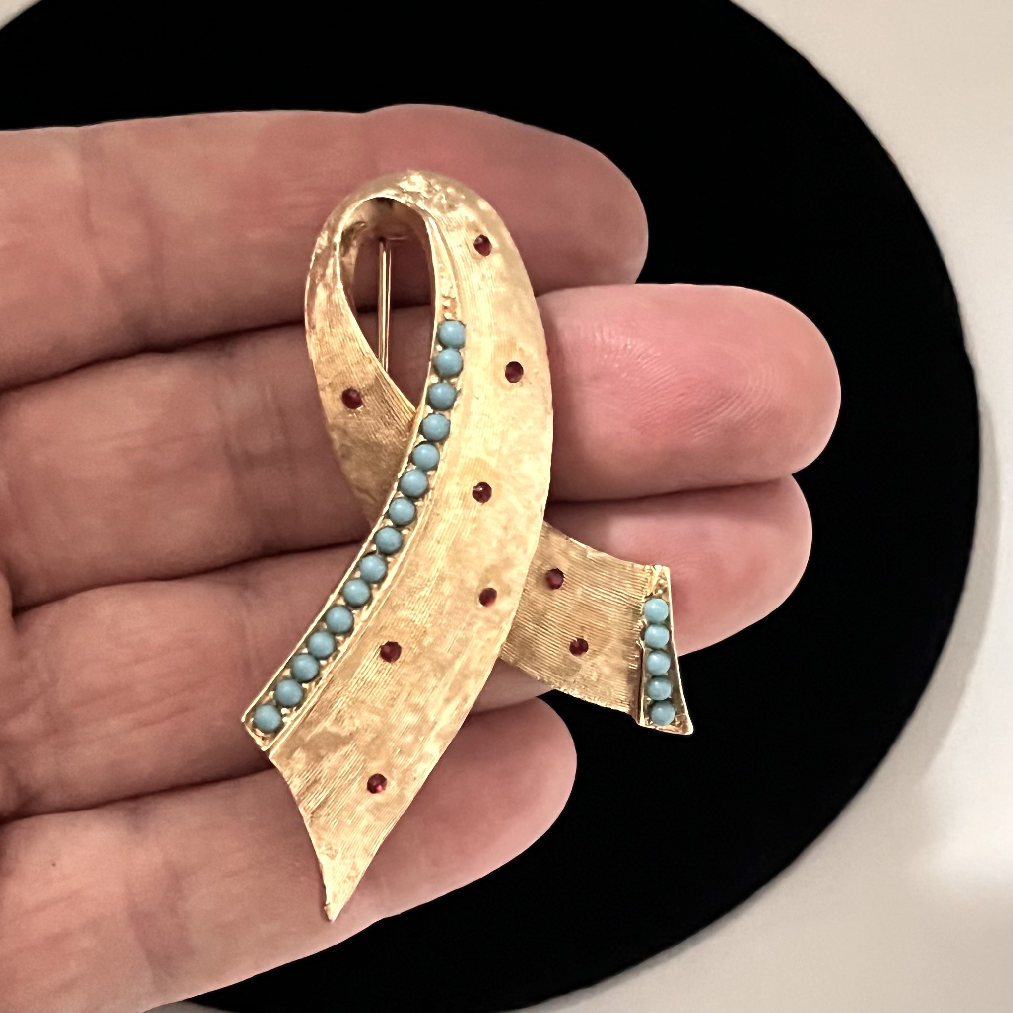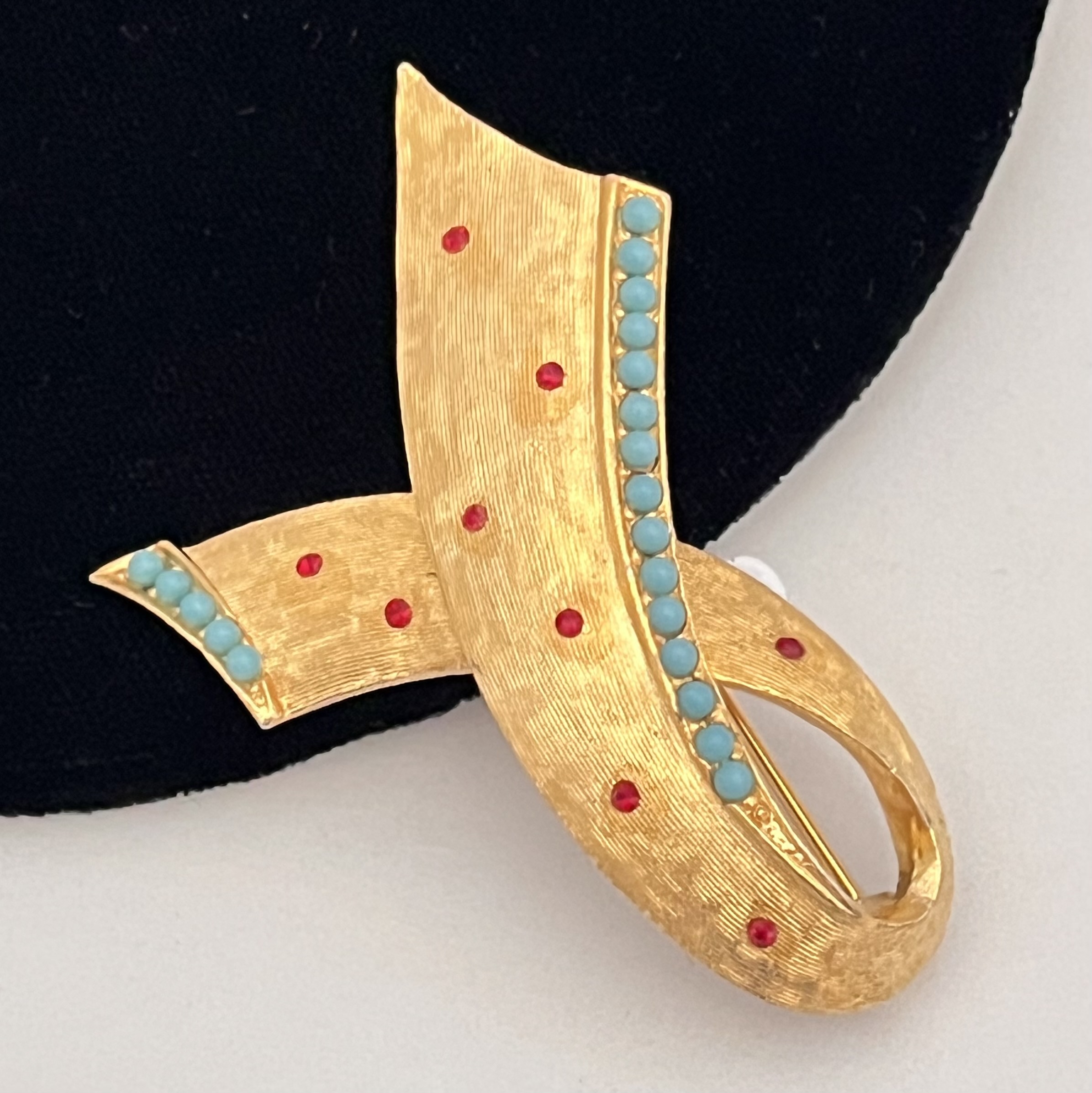 Entzückende 1960er Jahre Brosche aus den USA. Matt-goldfarbener Metallguss mit dunkelroten Strasselementen und türkisfarbenen Glasperlen. Auf der Rückseite bezeichnet: BSK. Sicherheitsverschluß. Guter Erhaltungszustand.