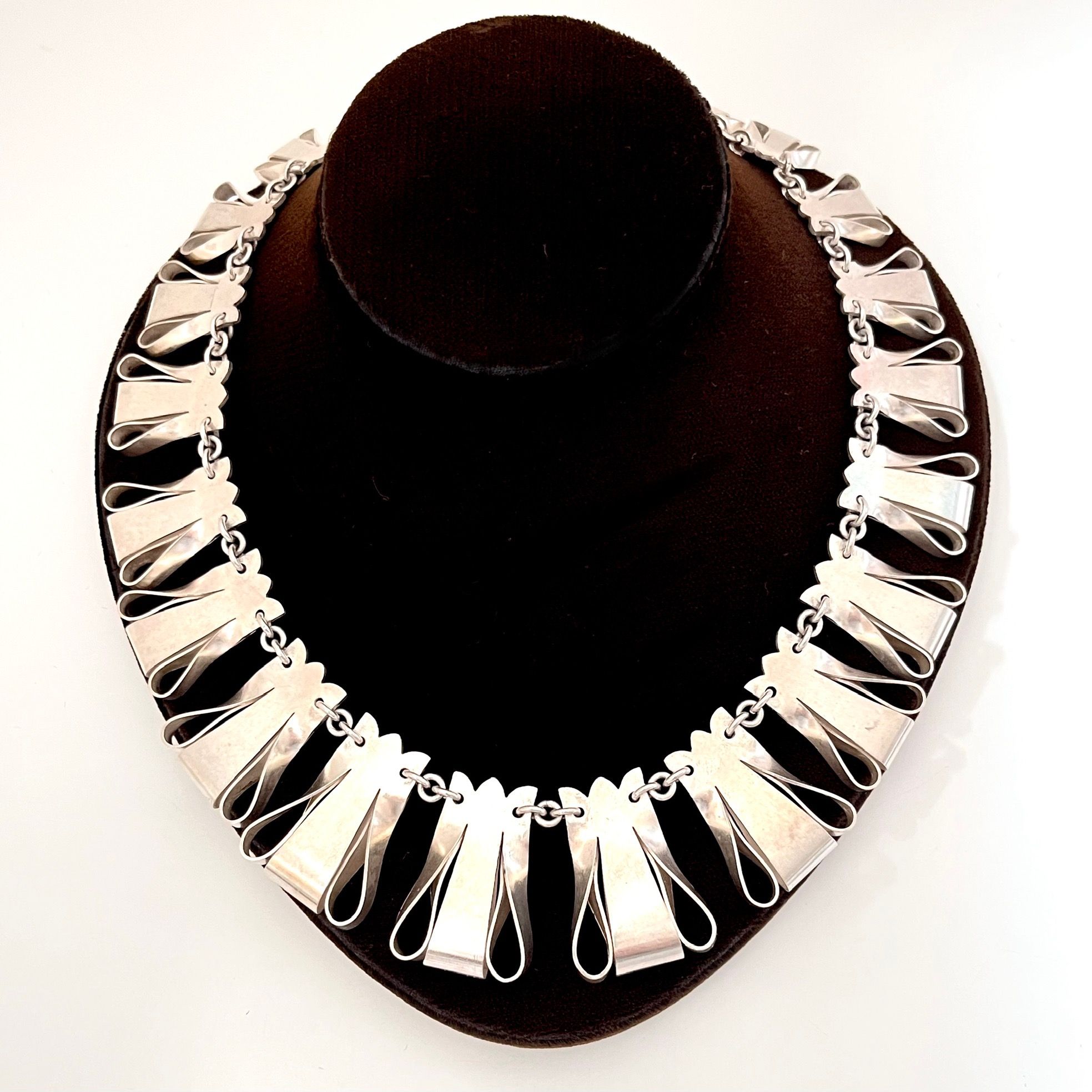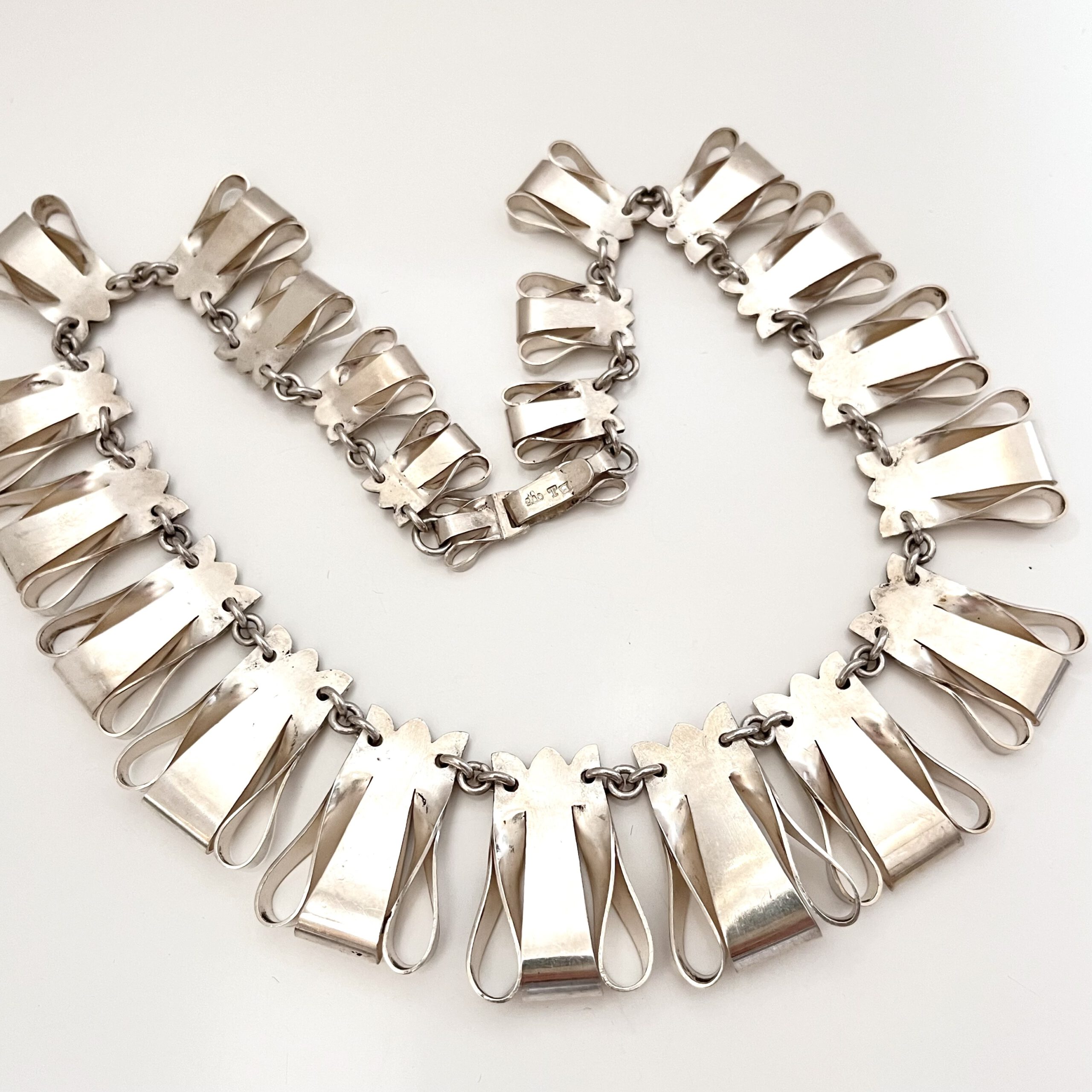 Opulente Silberkette mit ausgefallenem Schlaufendesign. Silberpunze auf der Schließe. Enganliegend.