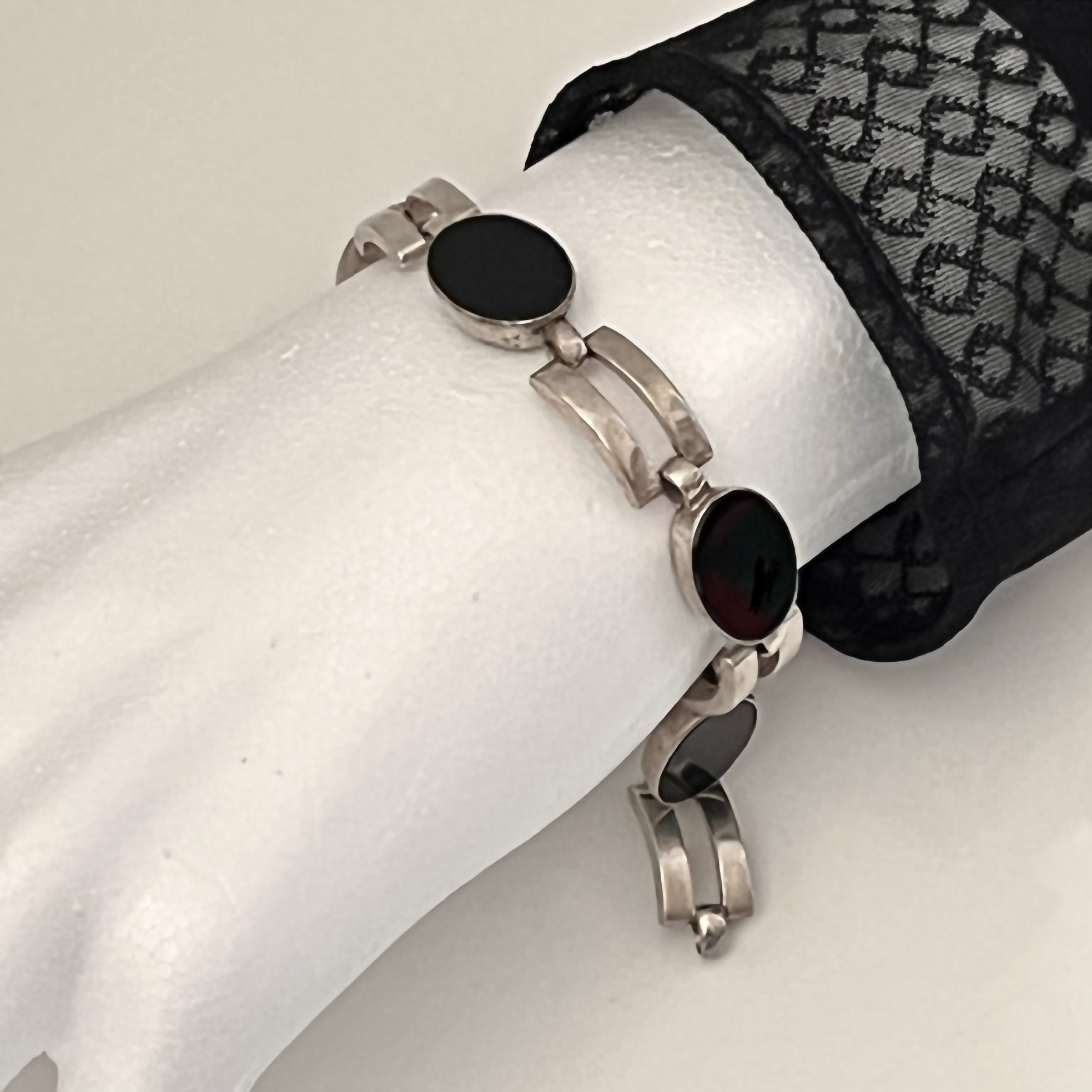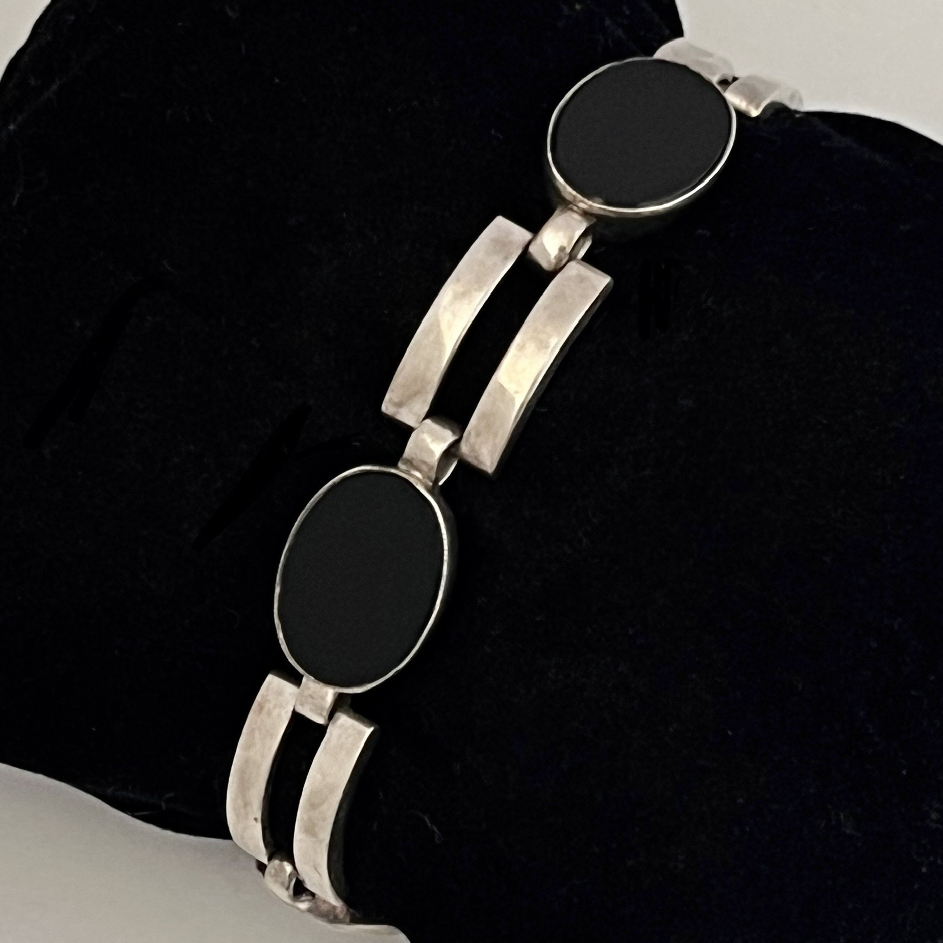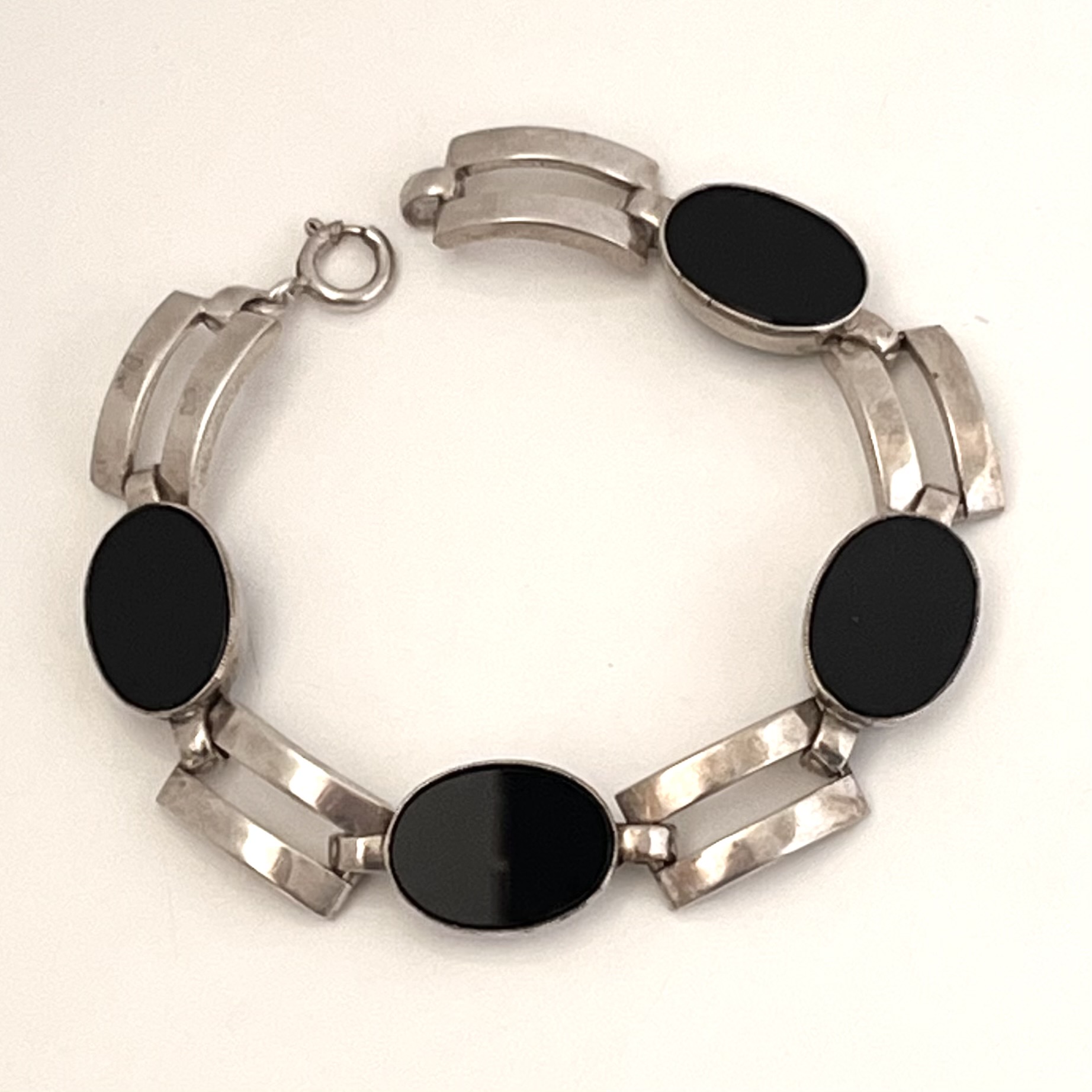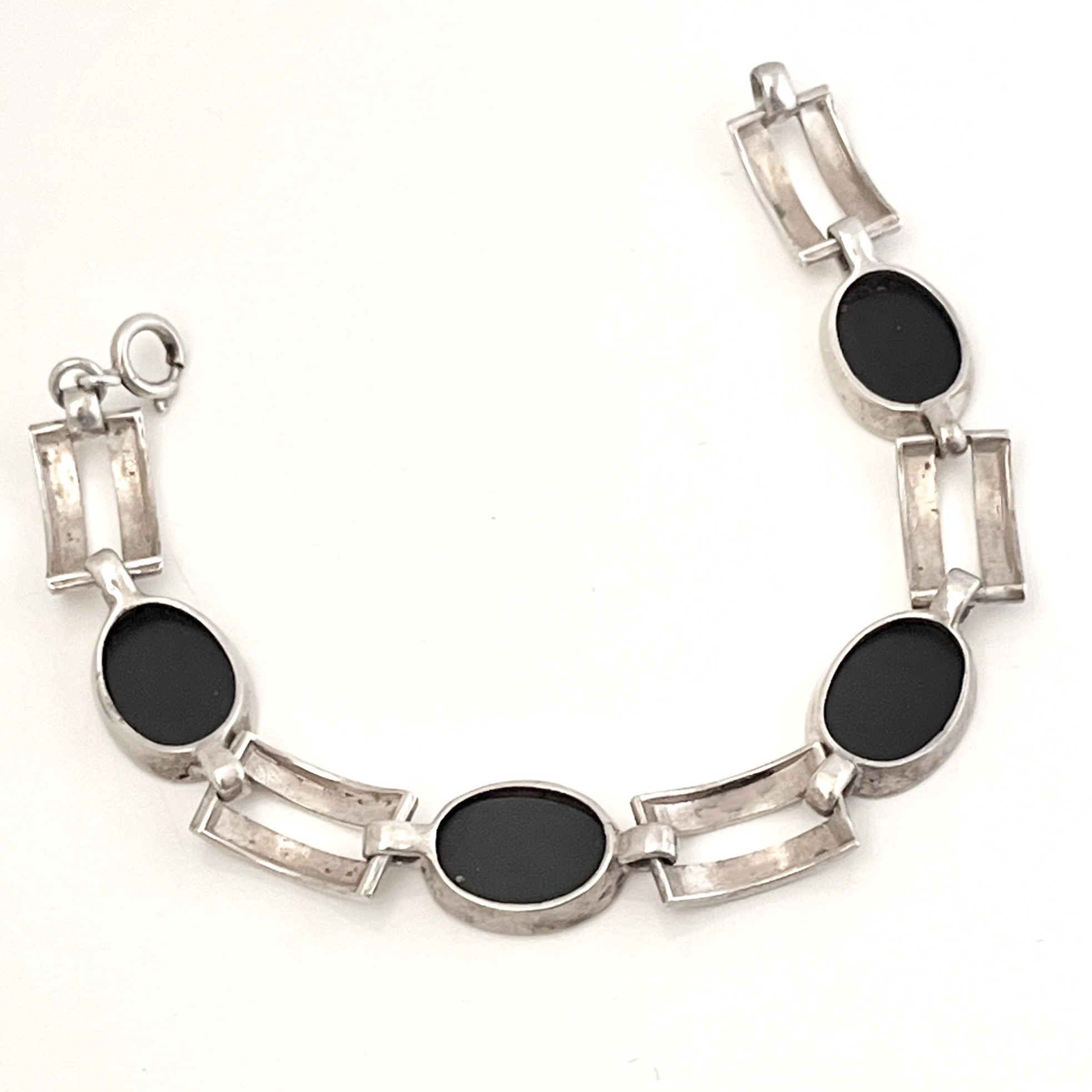 Hübsches Gliederarmband mit 4 ovalen Onyxsteinen. Mit seinen 18 cm Länge eher für ein schlankes Handgelenk geeignet. Auf der Rückseite gestempelt: 835. Guter Erhaltungszustand.