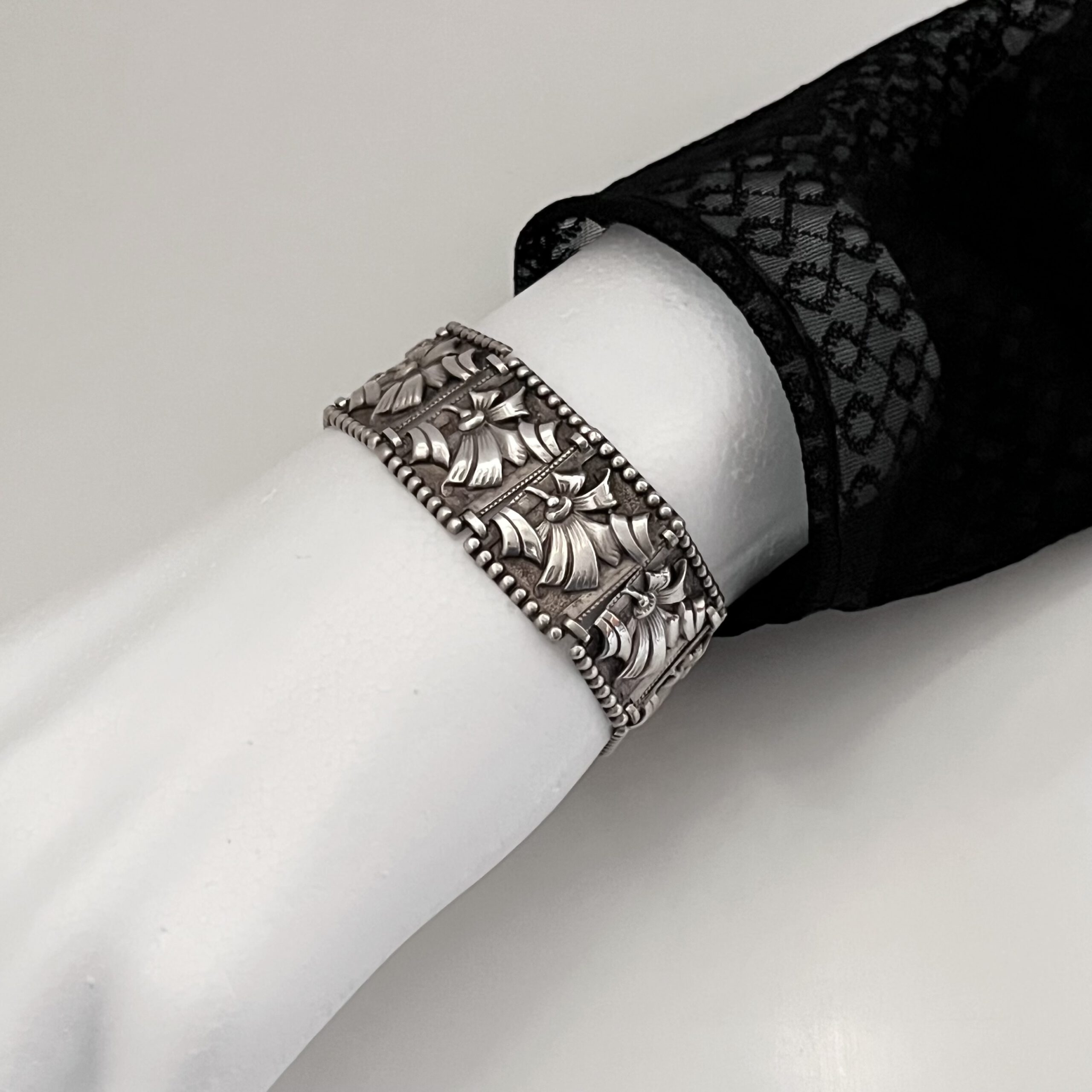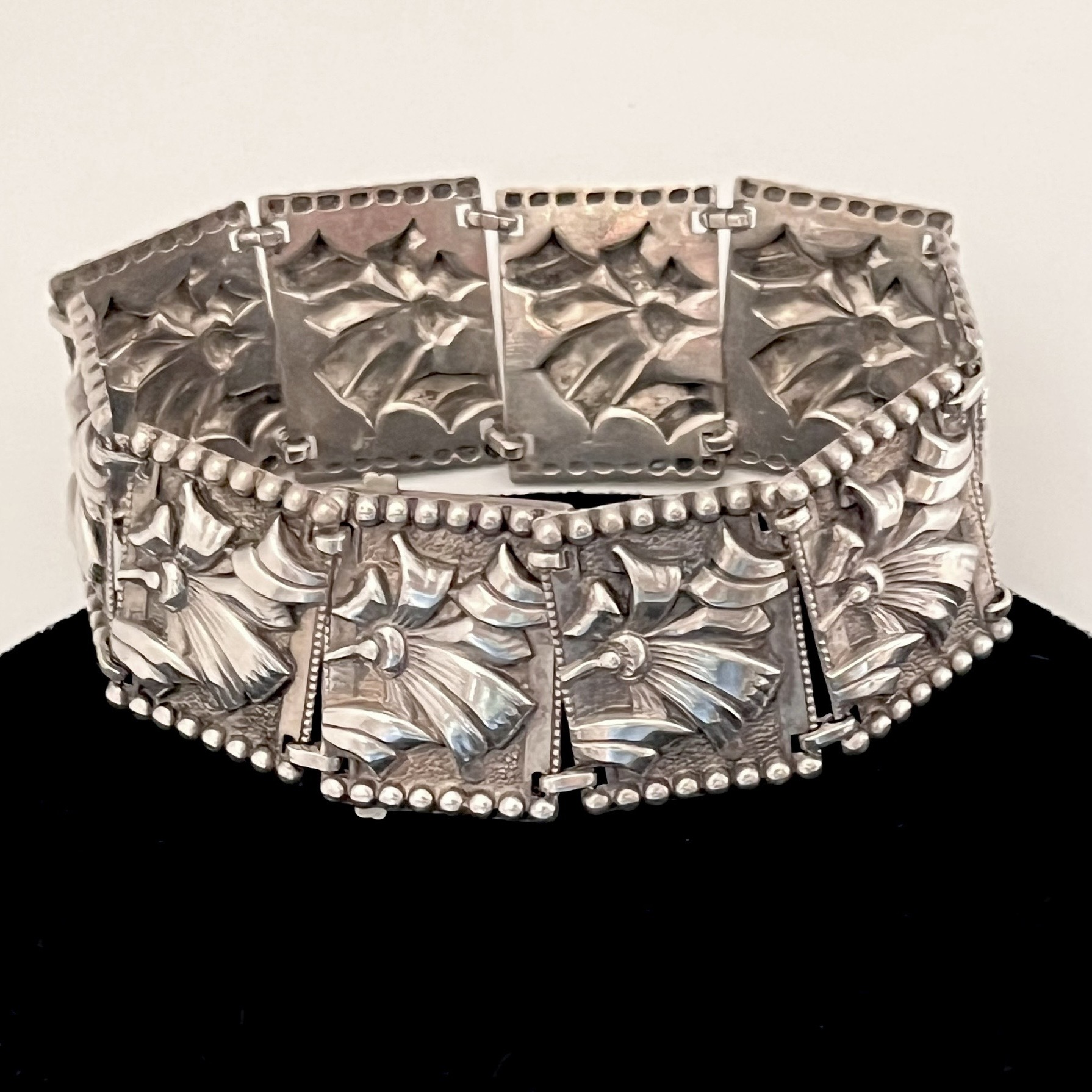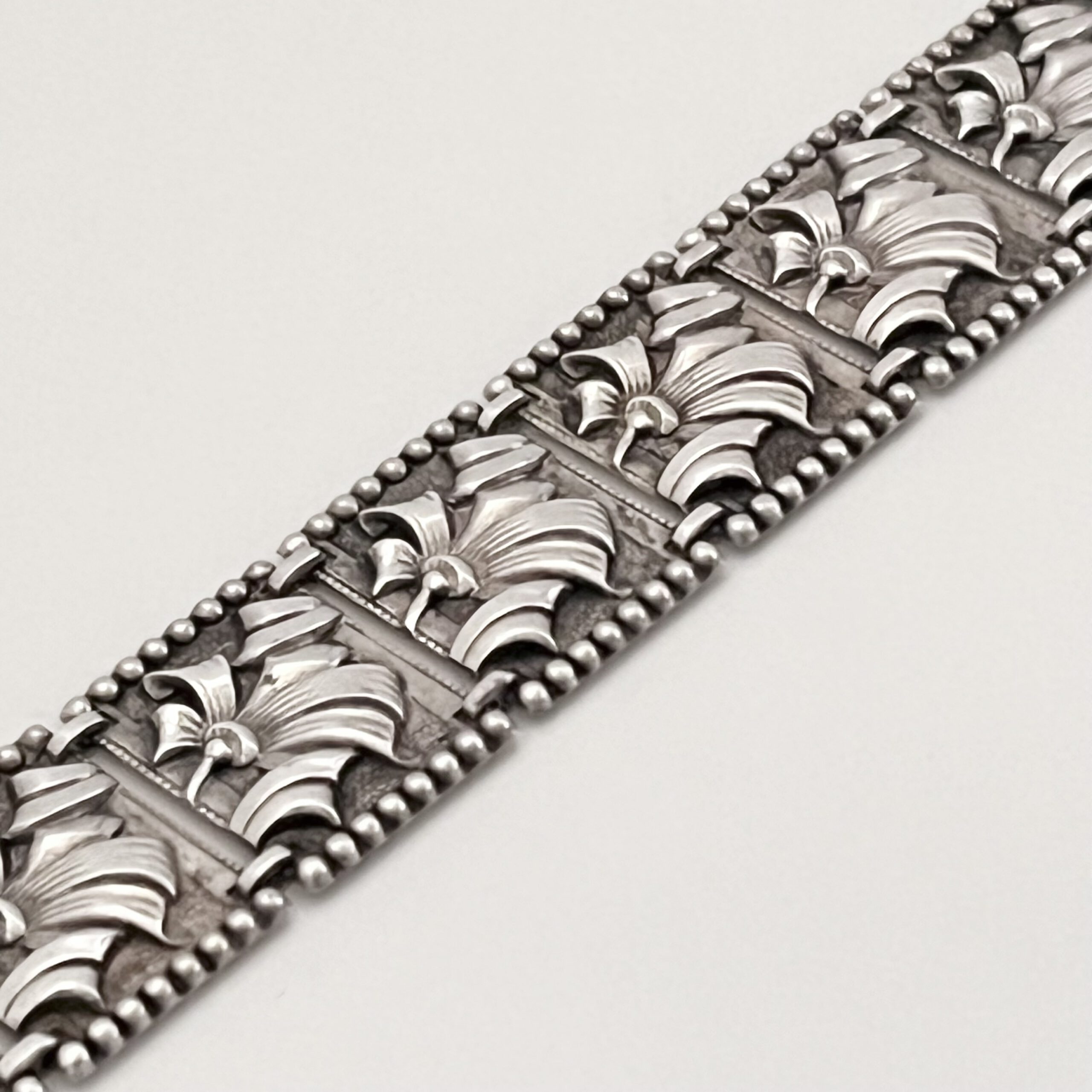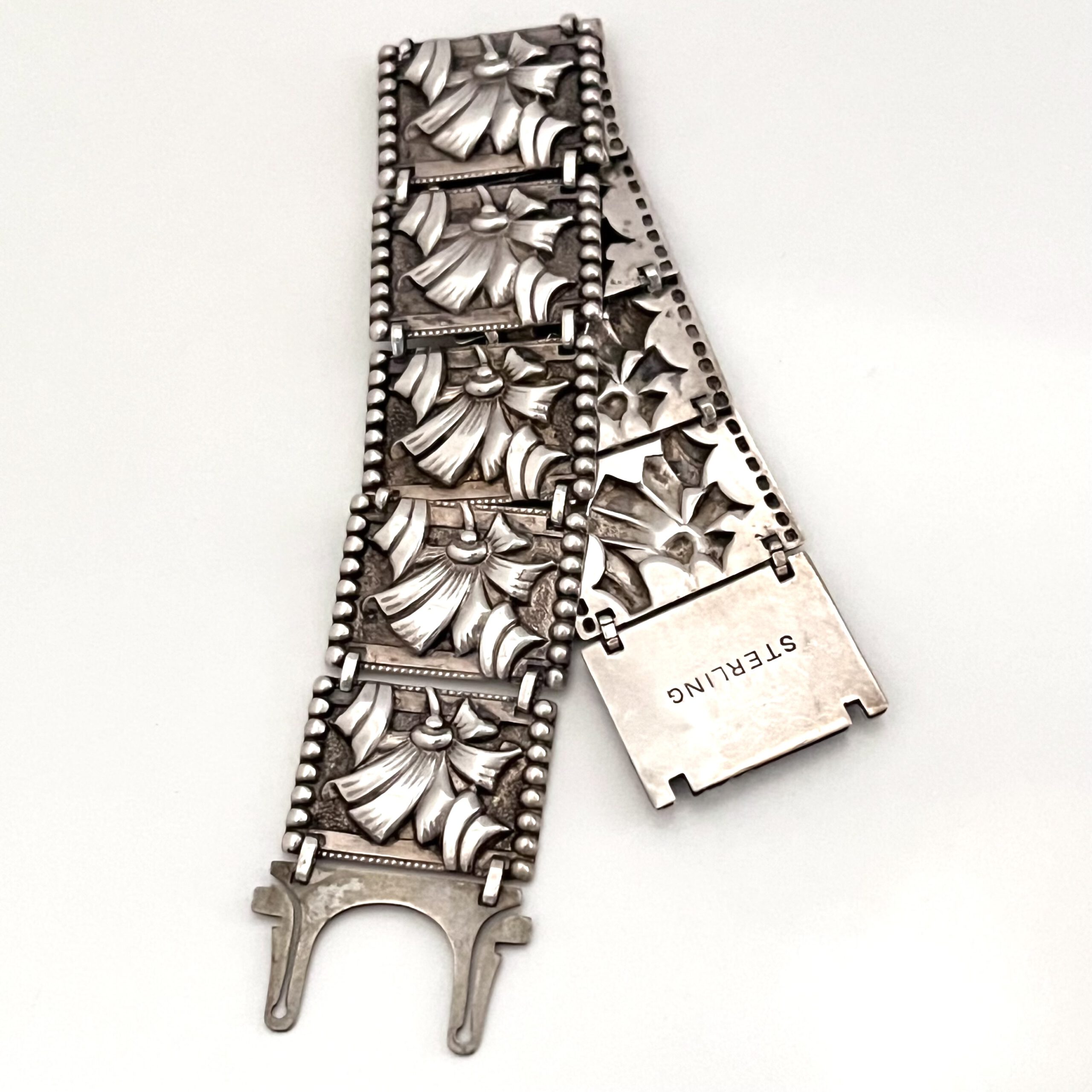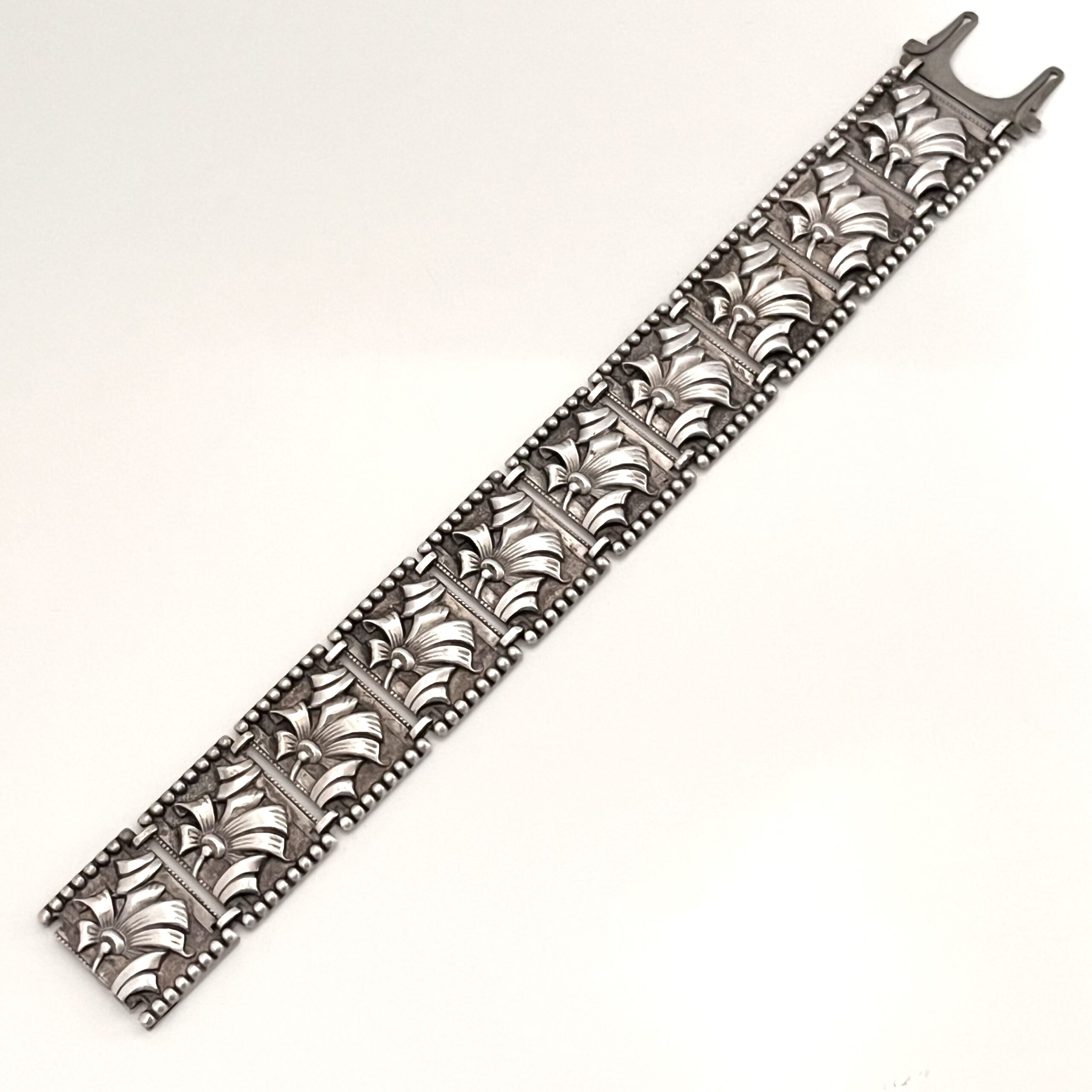 Florales Art Deco Armband, bestehend aus 10 aneinandergereihten Silberblechgliedern. Auf der Schließe bezeichnet: Sterling. Aparter Entwurf. Guter Originalzustand.
