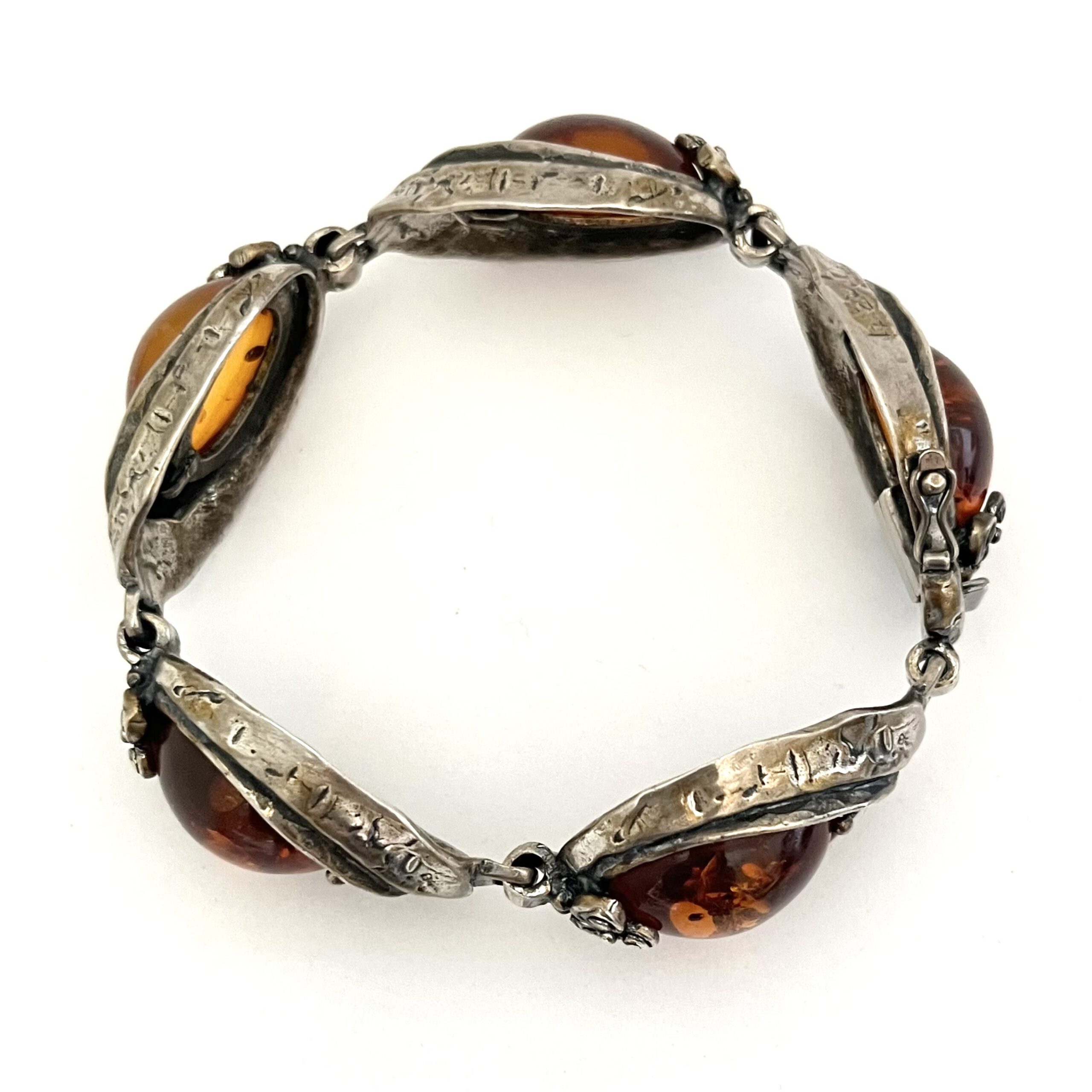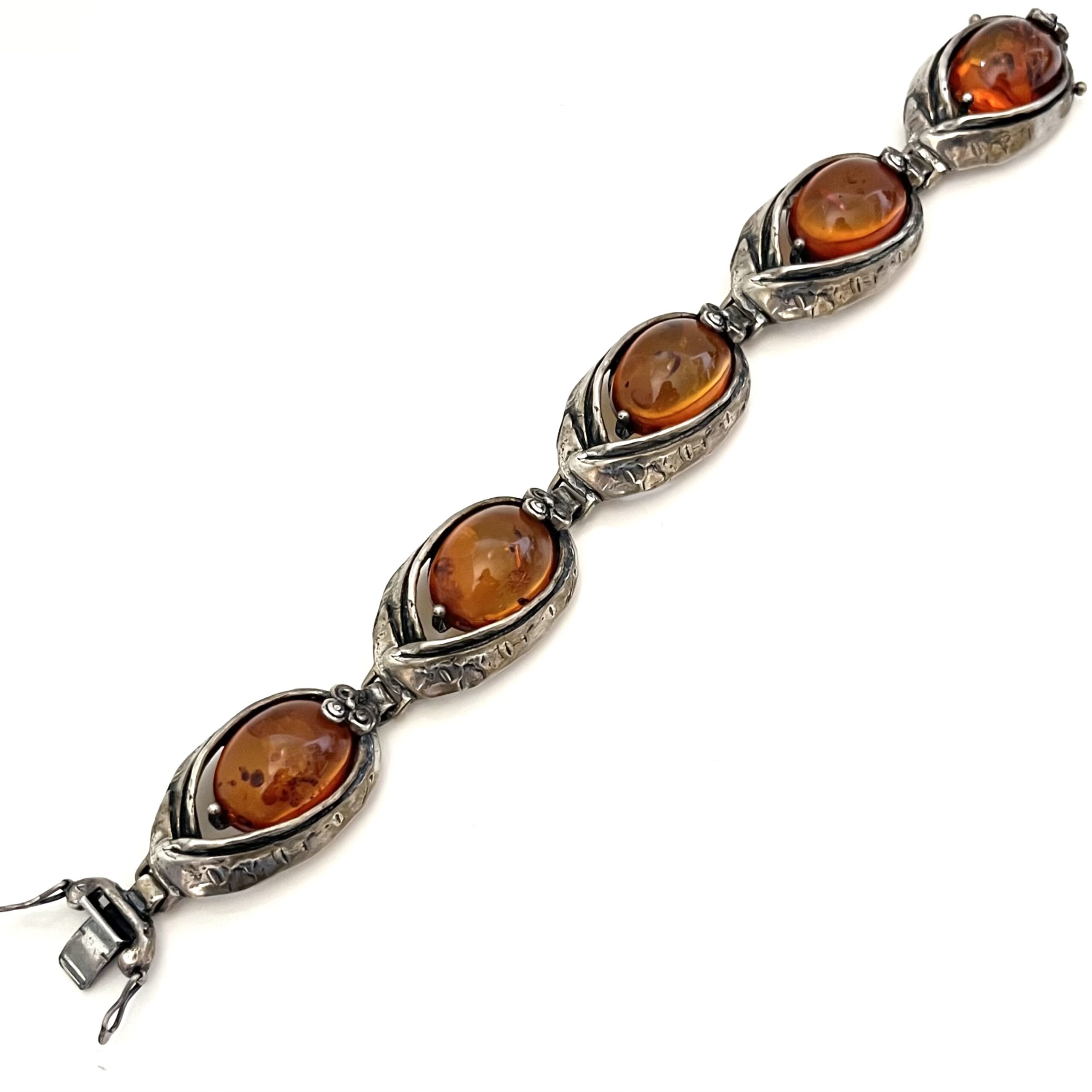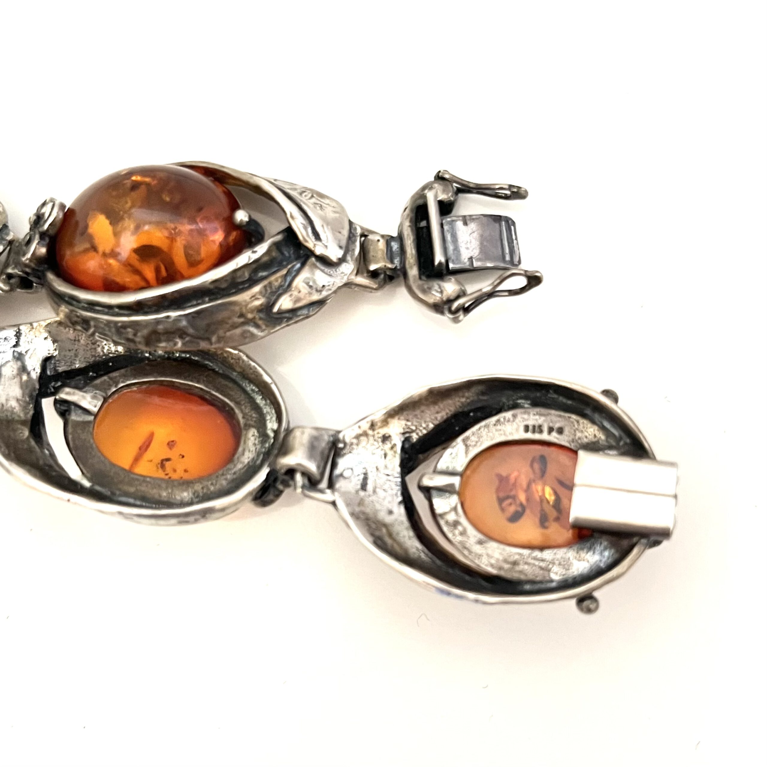 Hochwertig gearbeitetes Designer-Armband aus 835erSilber mit 5 Bernsteincabochons von der Firma Perli, Schwäbisch Gmünd, Deutschland. Doppel-Sicherungshaken. Rückseitig bezeichnet: 835 Pe