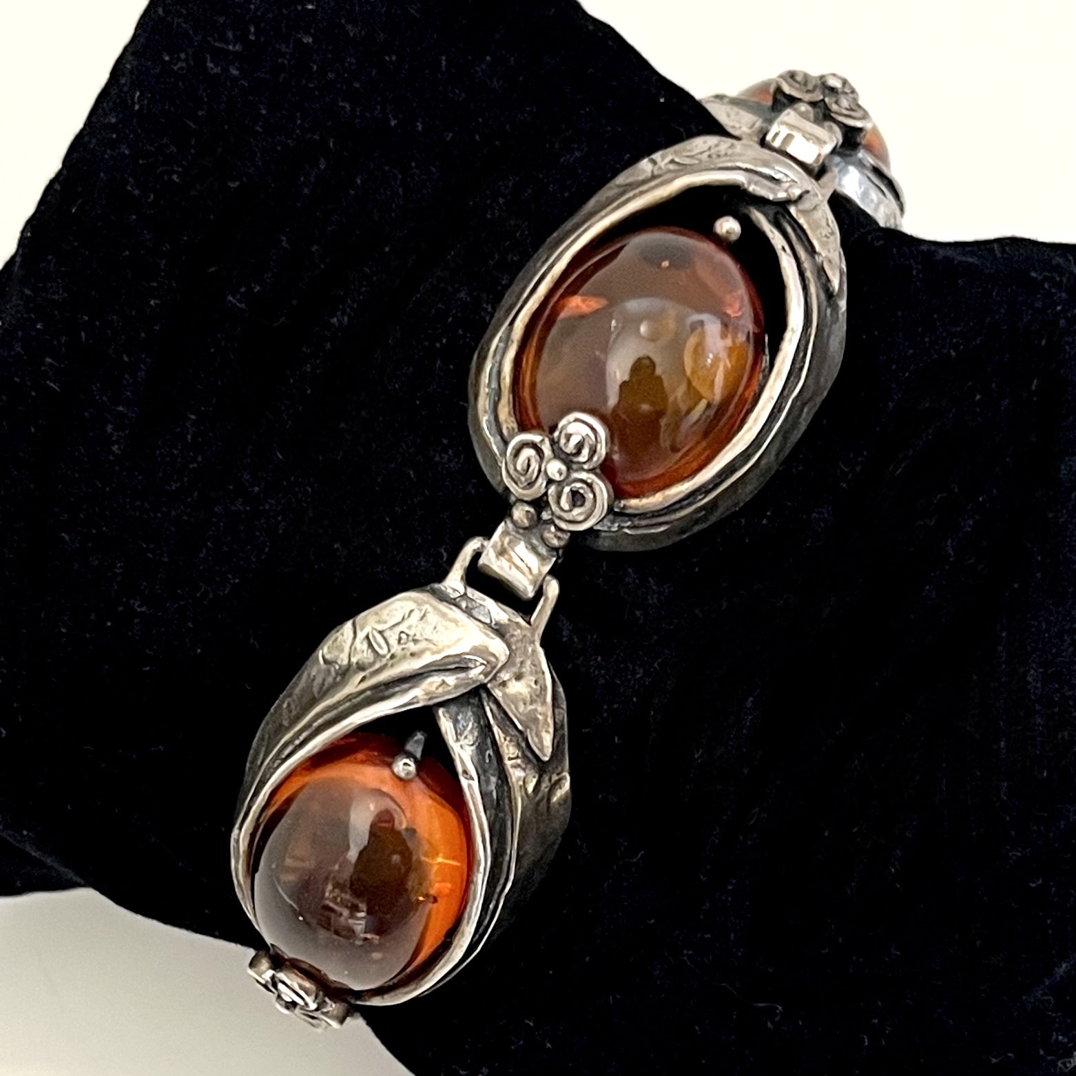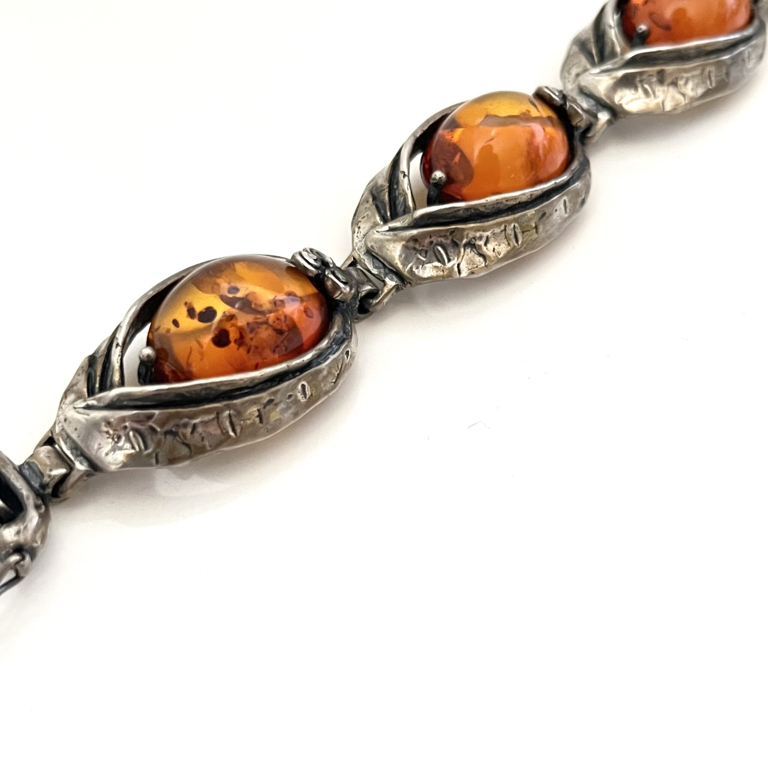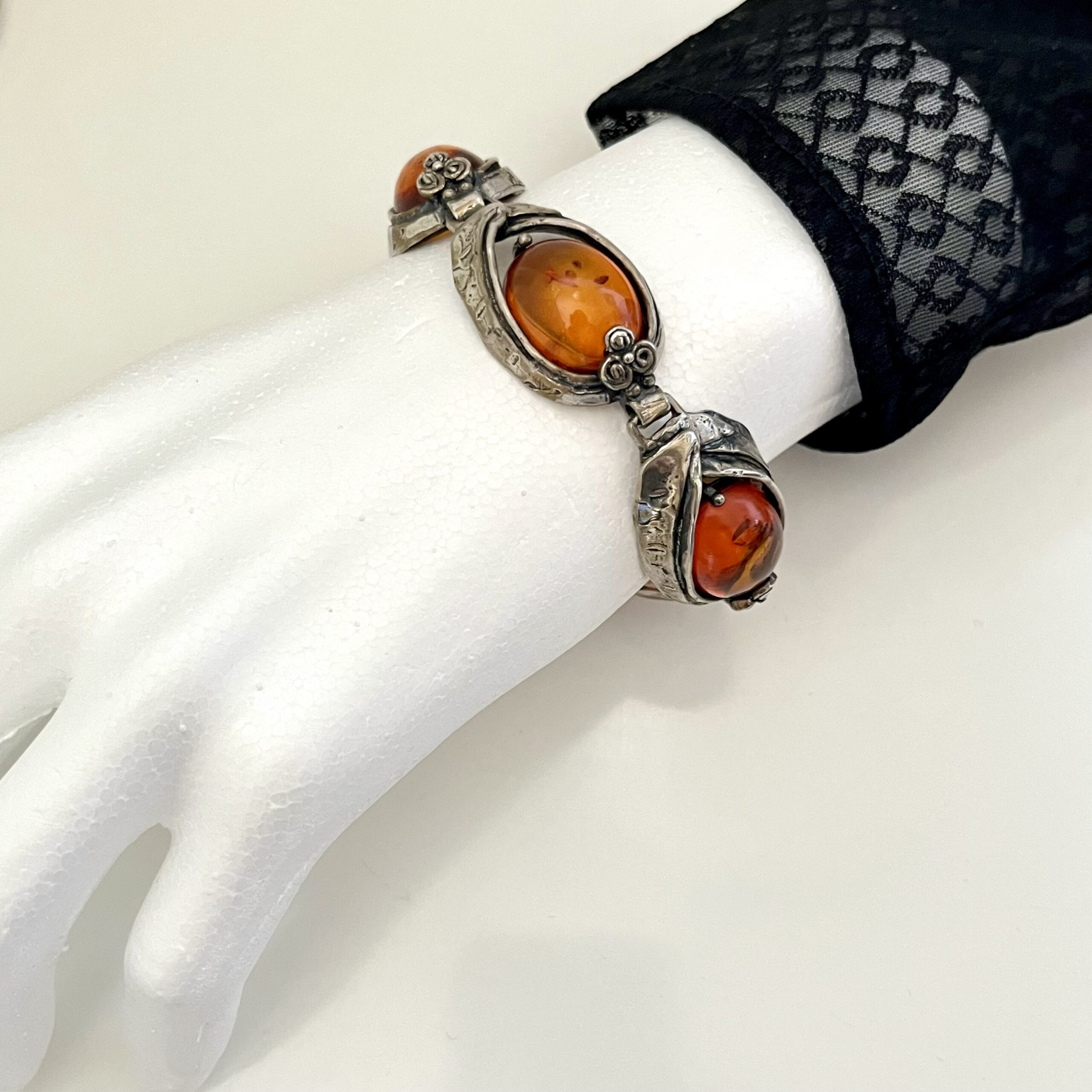 Hochwertig gearbeitetes Designer-Armband aus 835erSilber mit 5 Bernsteincabochons von der Firma Perli, Schwäbisch Gmünd, Deutschland. Doppel-Sicherungshaken. Rückseitig bezeichnet: 835 Pe
