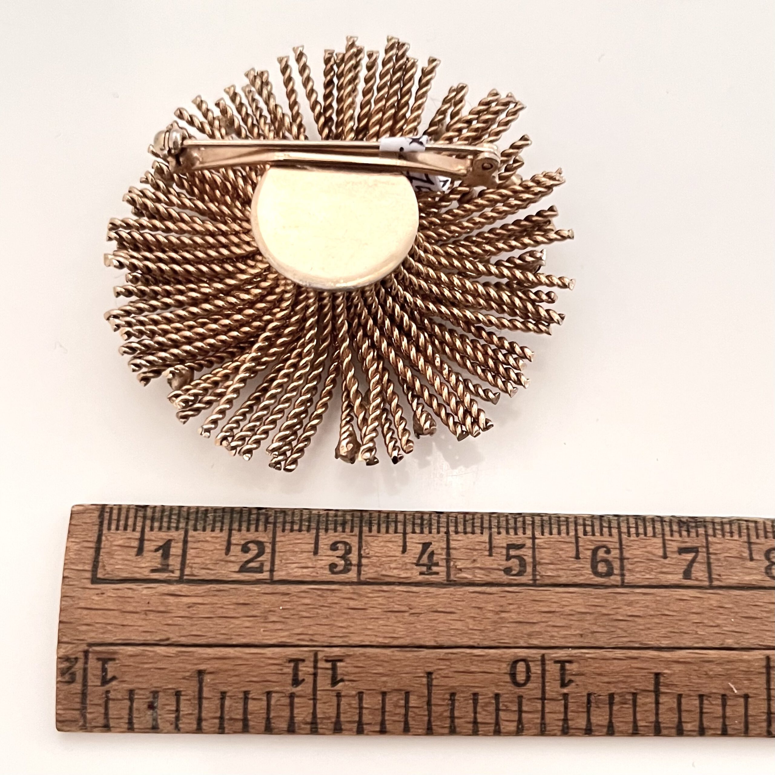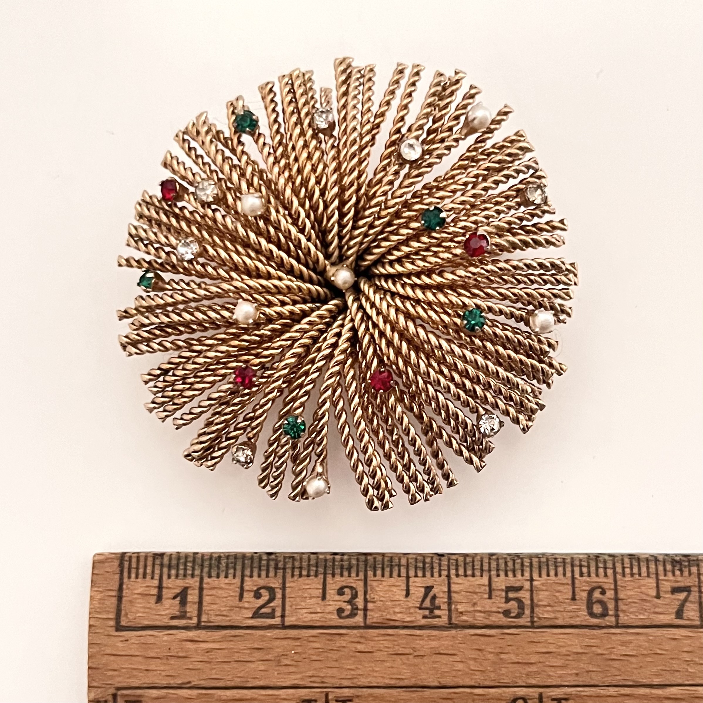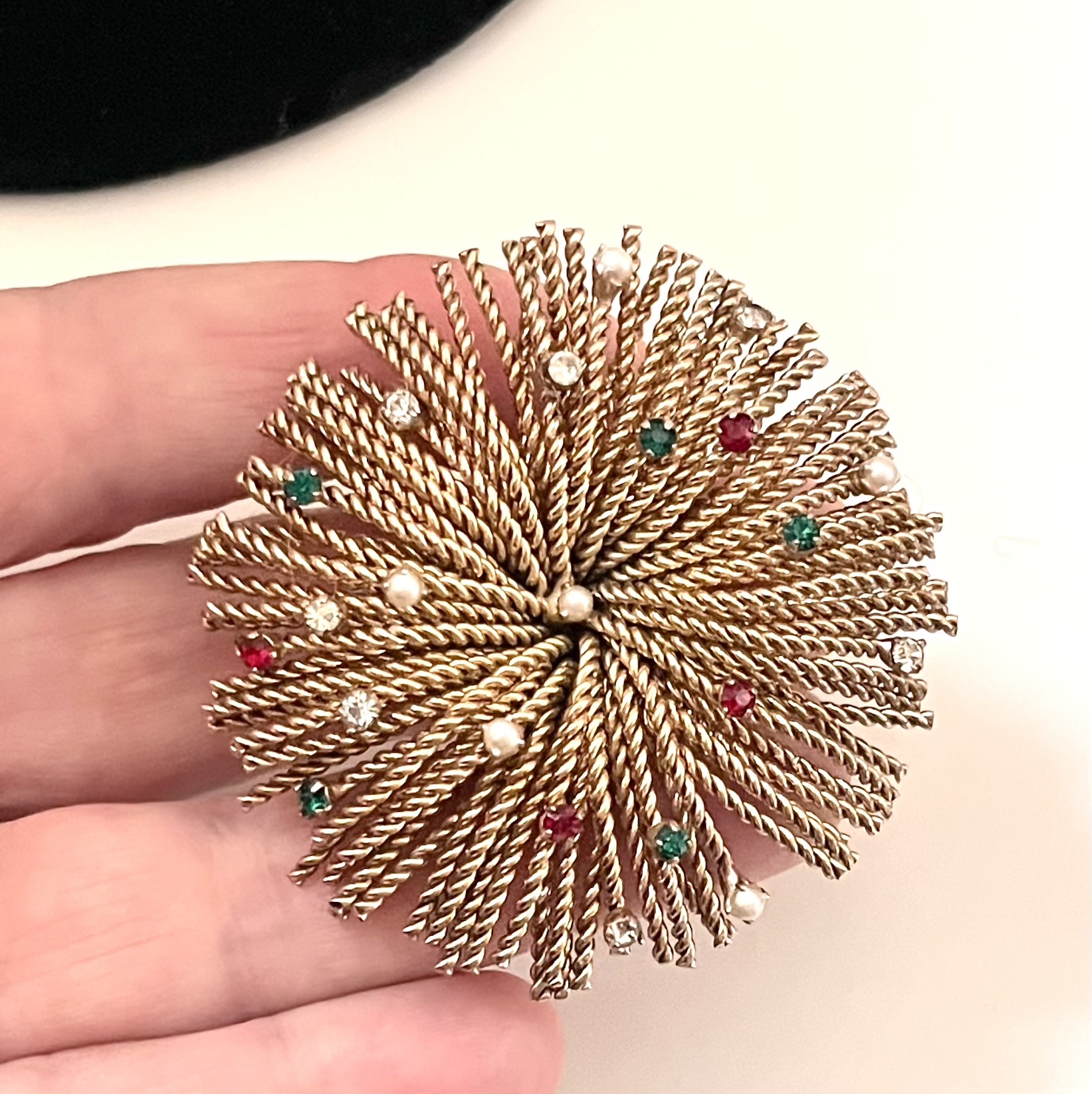 Kleines Feuerwerk: aparte Brosche aus matt-goldfarbenem Metall, kleinen Kunstperlen und Strass in rot, grün und klar. Sicherheitsverschluß. Nicht ganz leicht, daher eher für einen kräftigeren Stoff geeignet.