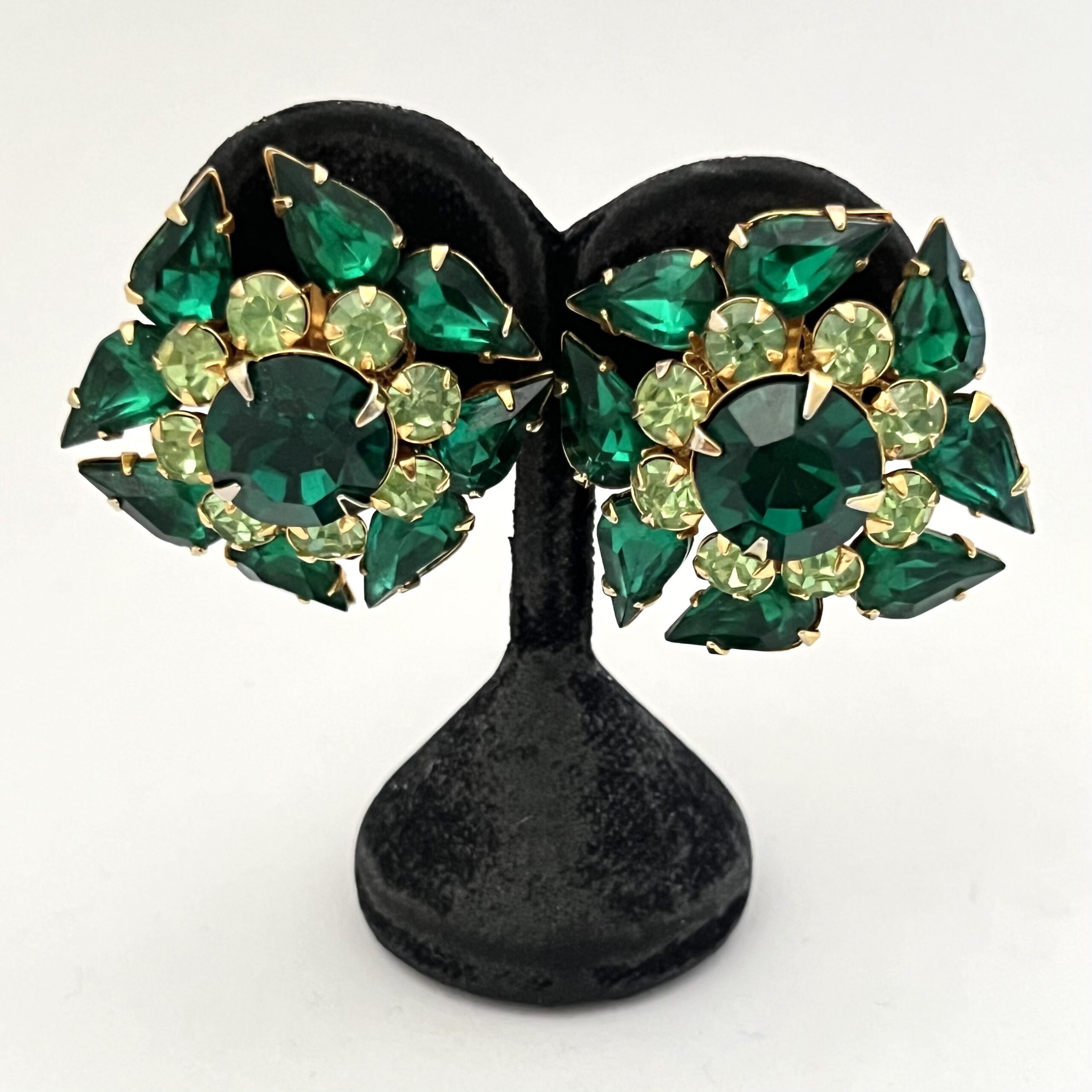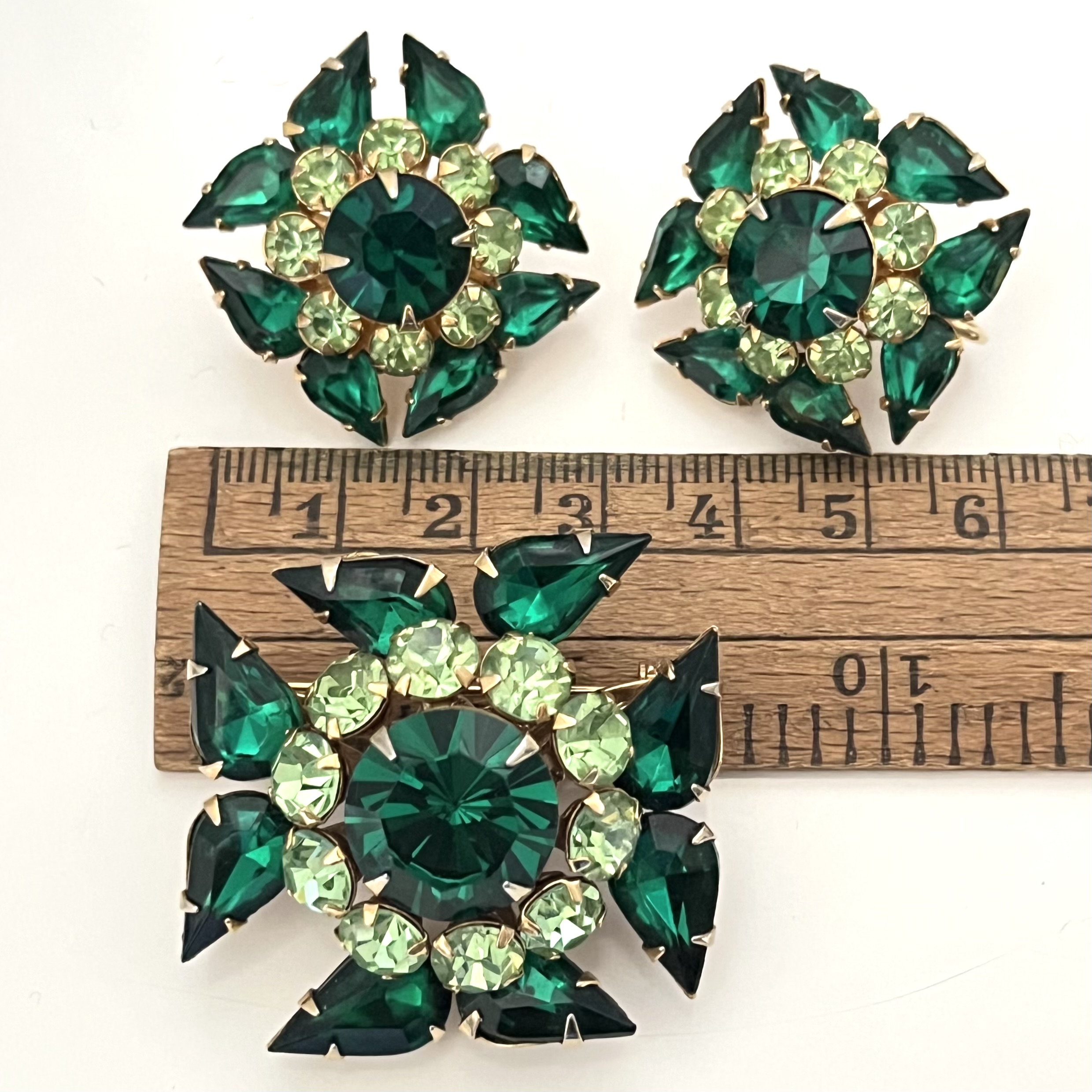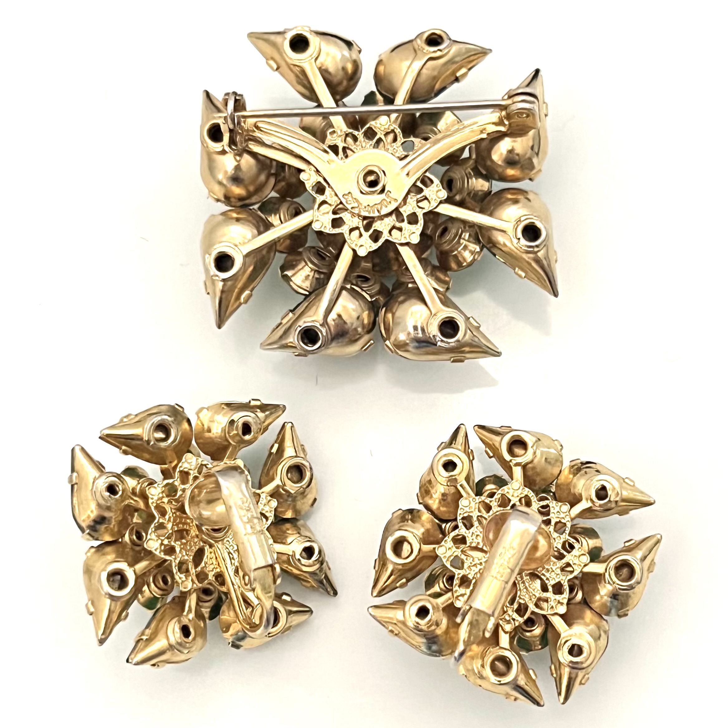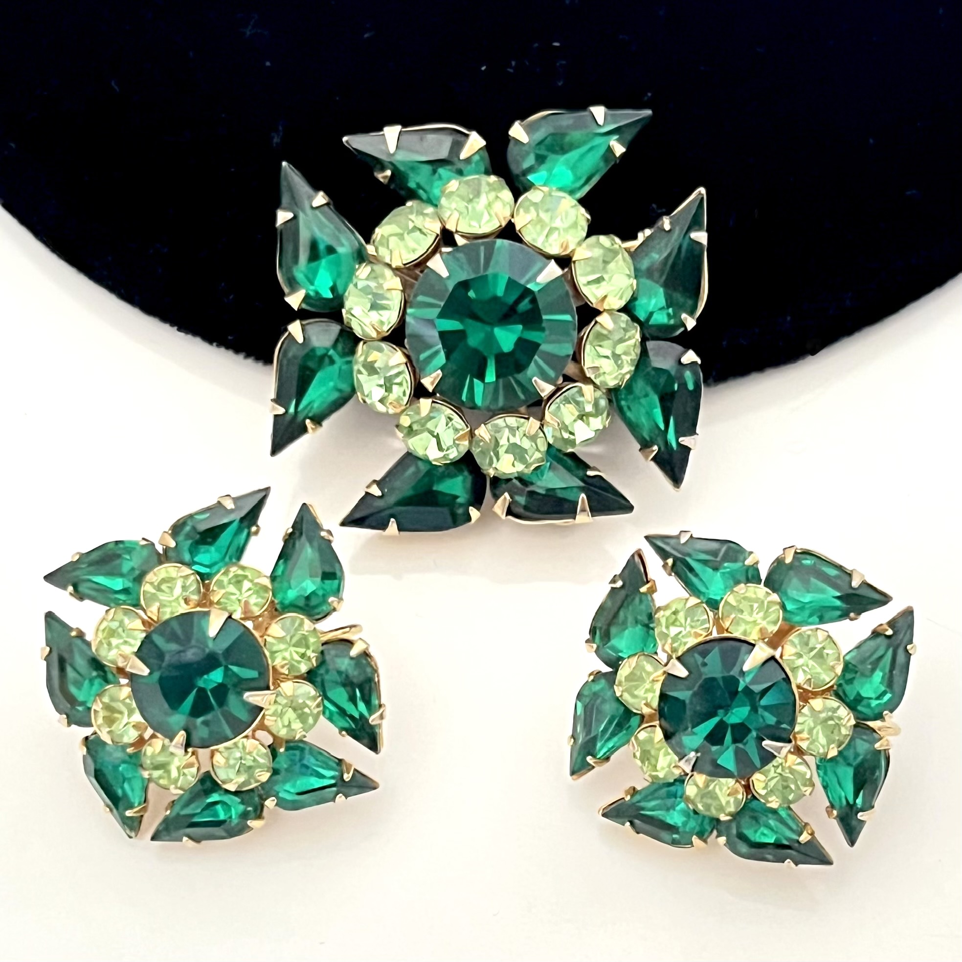 Grüne Strassbrosche mit passenden Ohrclips von Judy Lee, USA.