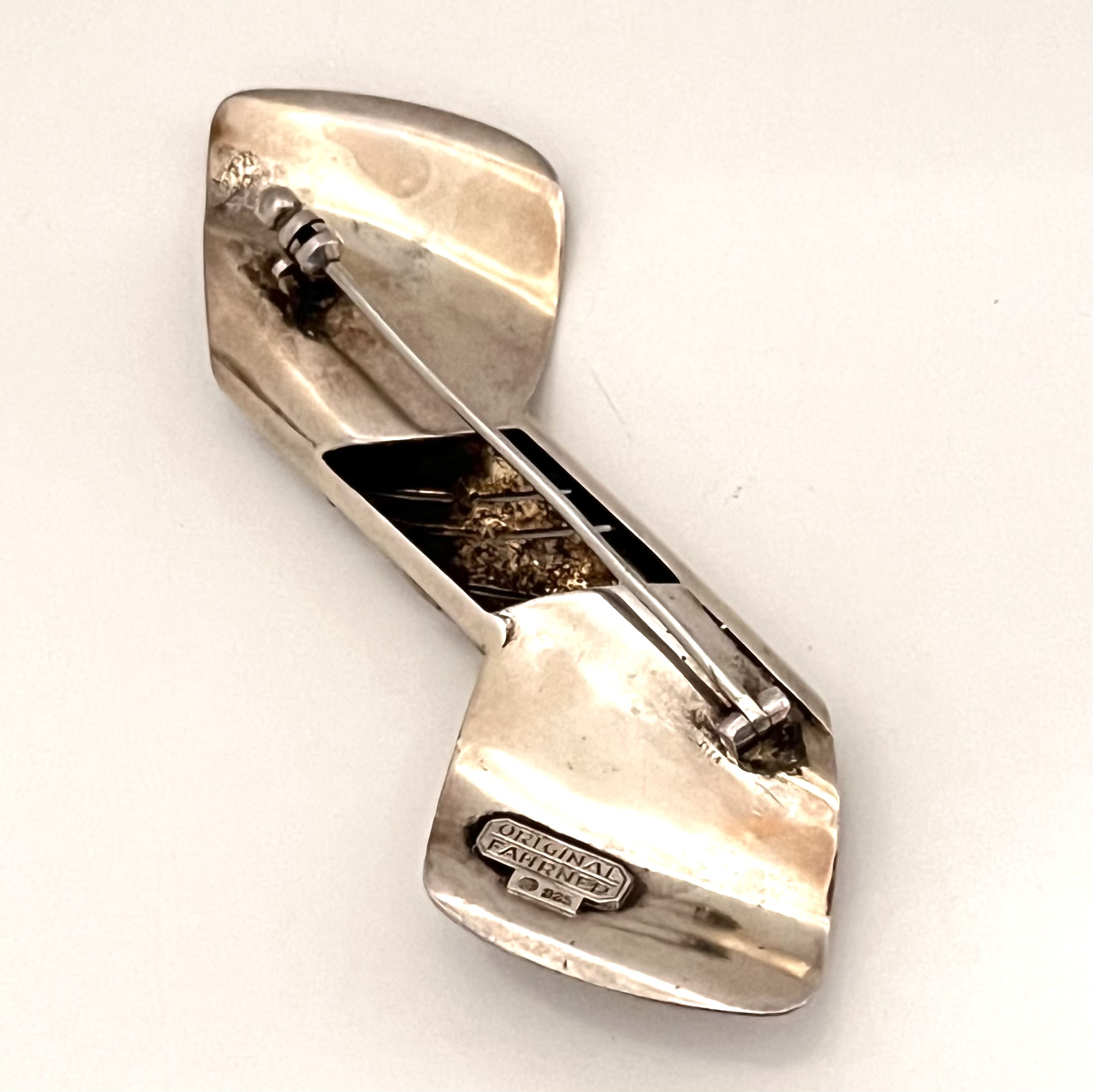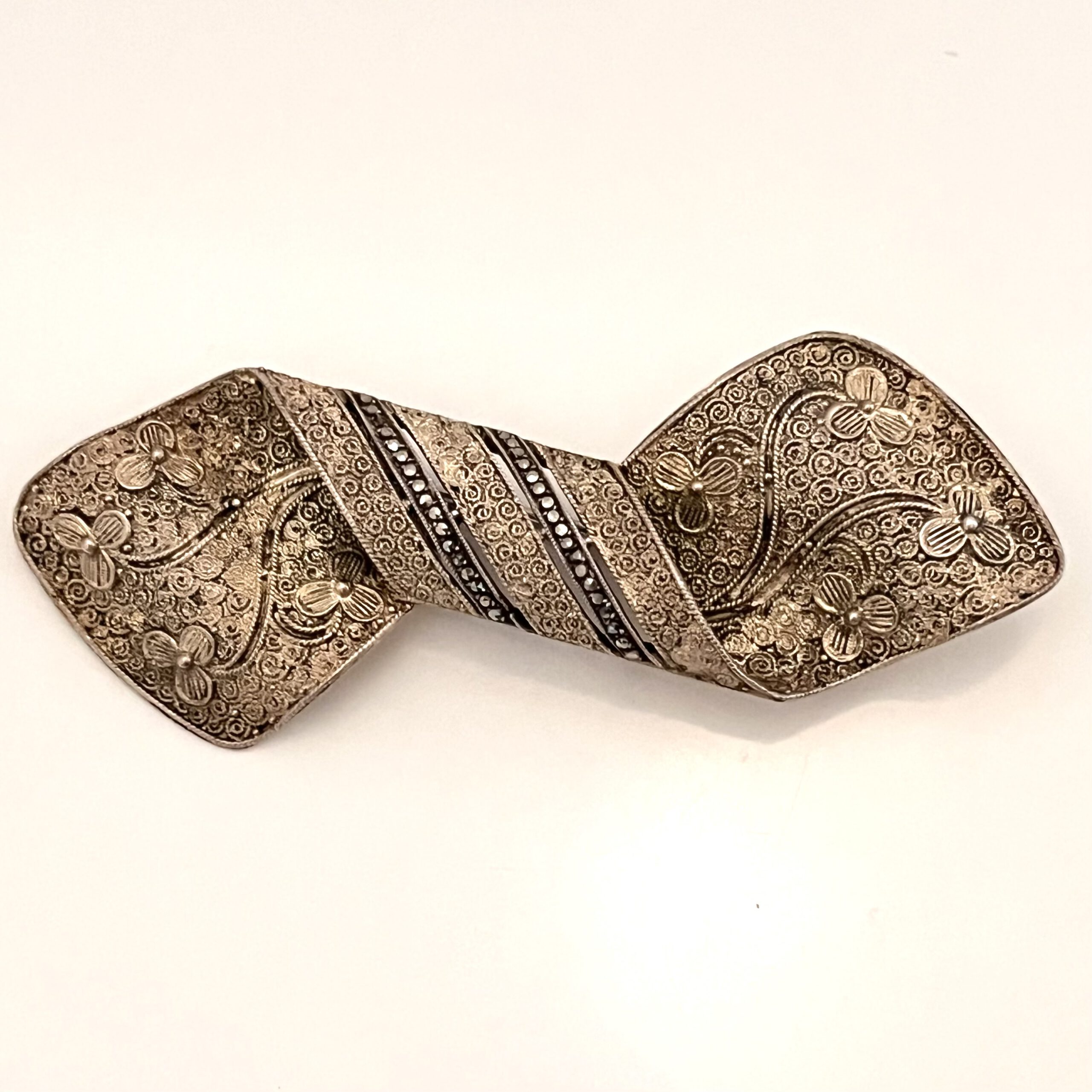 Fein gearbeitete Brosche von Theodor Fahrner, Pforzheim. Stilisiertes Schleifenmotiv. Sehr schöne Oberflächenstruktur. Kleine Markasitakzente. Wundervolles Stück. Signatur auf der Rückseite. Sicherheitsverschluß. Guter Erhaltungszustand.