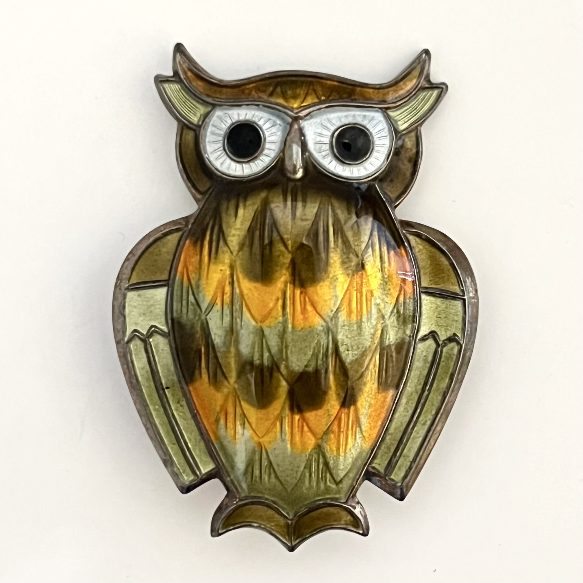 Brosche in Form einer Eule aus Sterlingsilber, vergoldet. Farbig emailliert. Rückseitig gemarkt: David Andersen, Norway, 925.