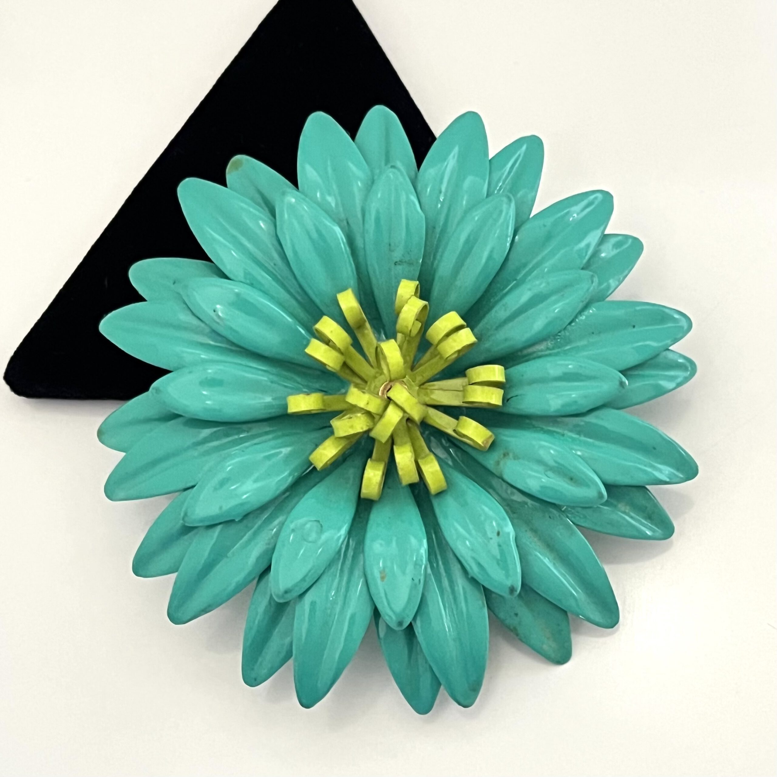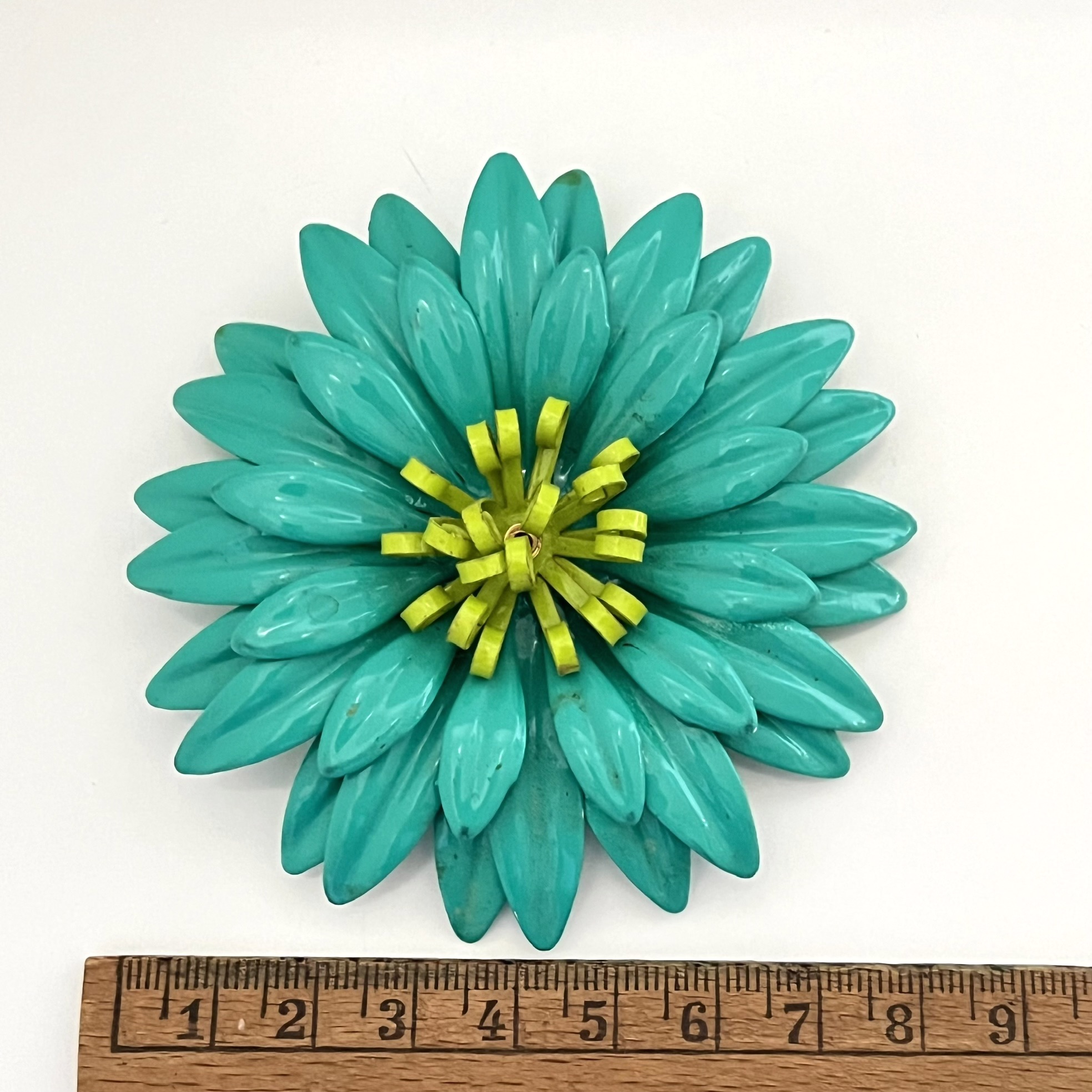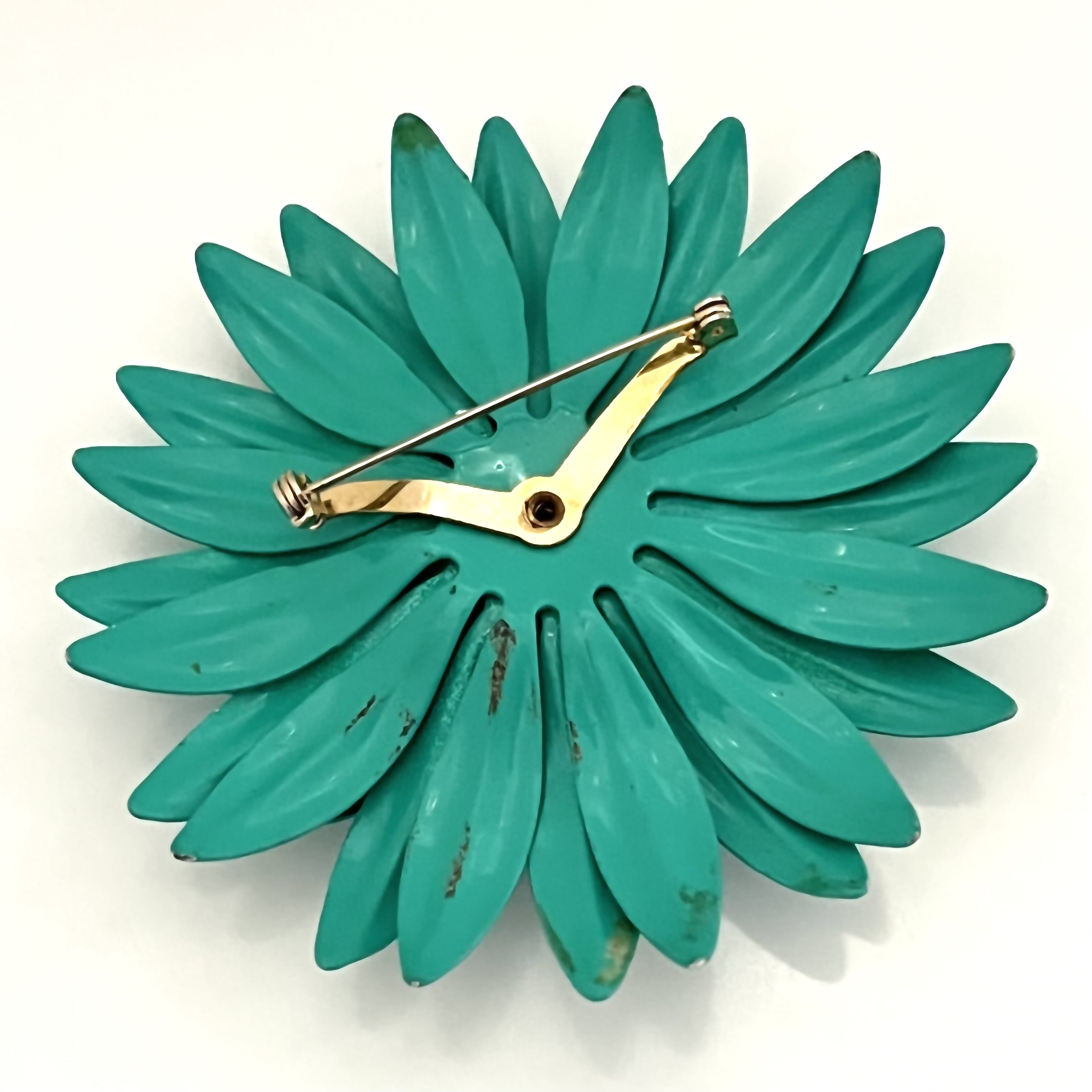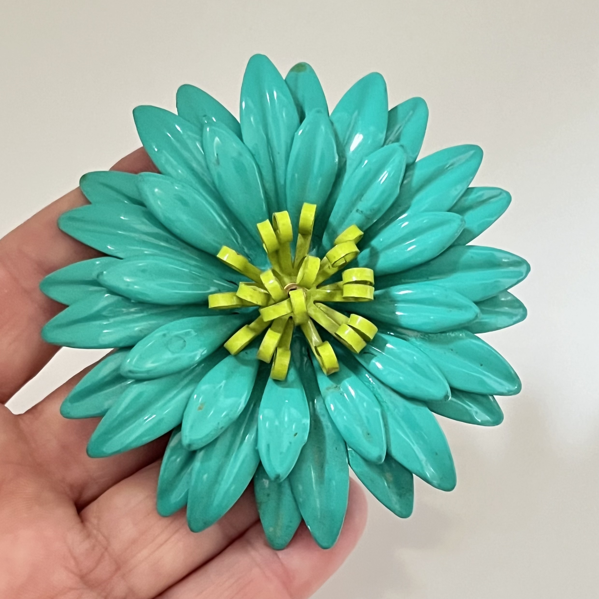 Große plakative Metallblumenbrosche in leuchtenden Farben. Türkisblau und Hellgrün.Sicherheitsverschluß. Originalzustand mit etwas ‚Patina‘ 🙂