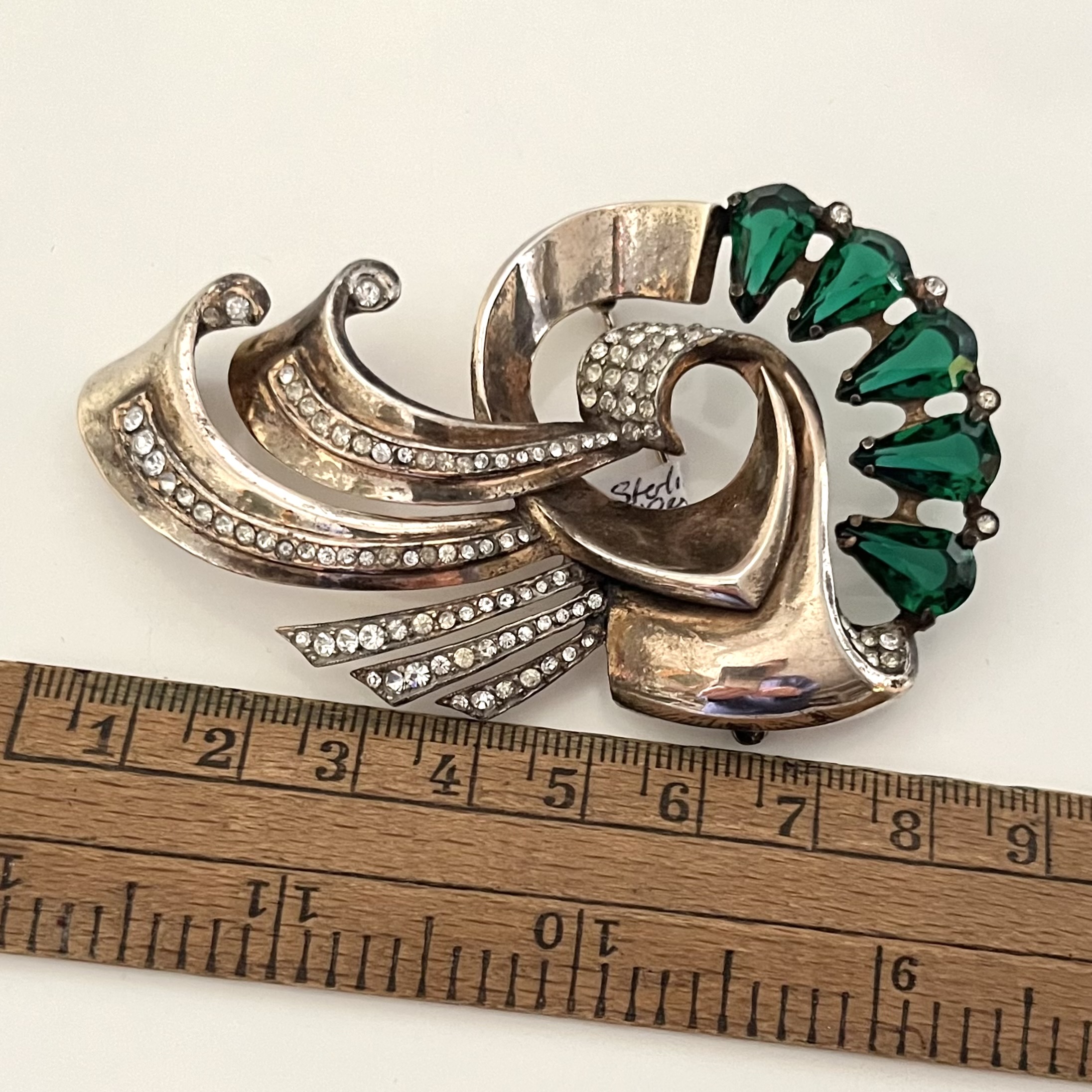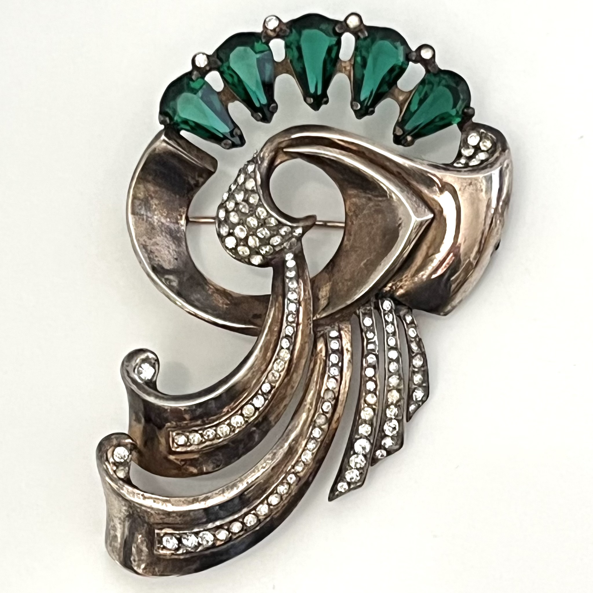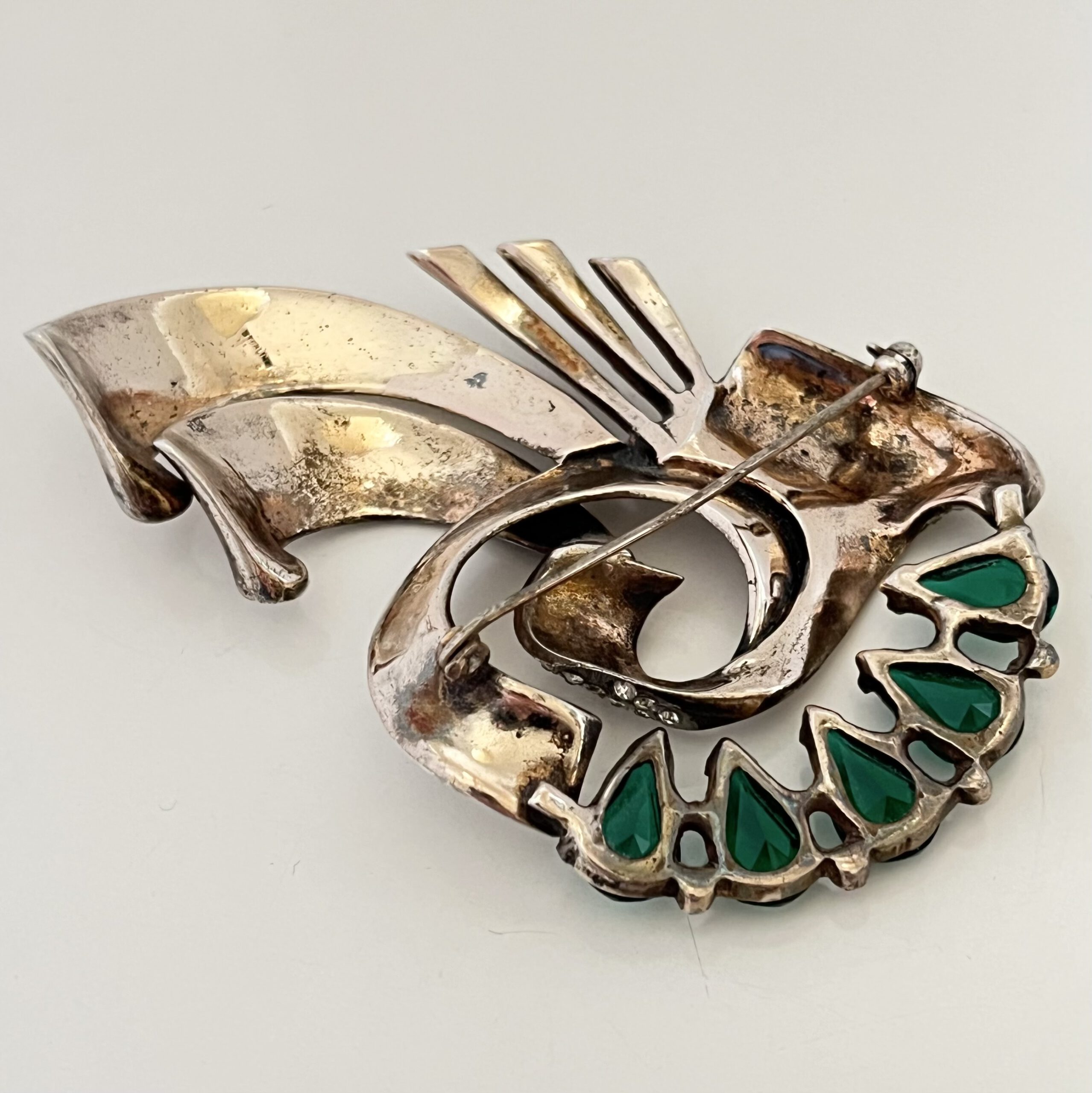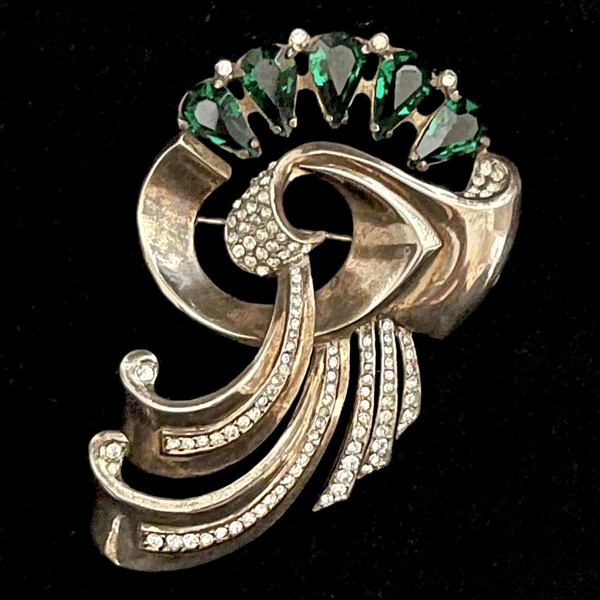 Großartige Brosche aus den USA der frühen 1940er Jahre. Sterlingsilber mit Rotvergoldung, smaragdgrüne Strasstropfen, klare Strasssteine. Sicherheitsverschluß. Hochwertiges Stück. Guter Originalzustand mit nur kleinen alterstypischen Gebrauchsspuren. Auf der Rückseite gemarkt: Sterling
