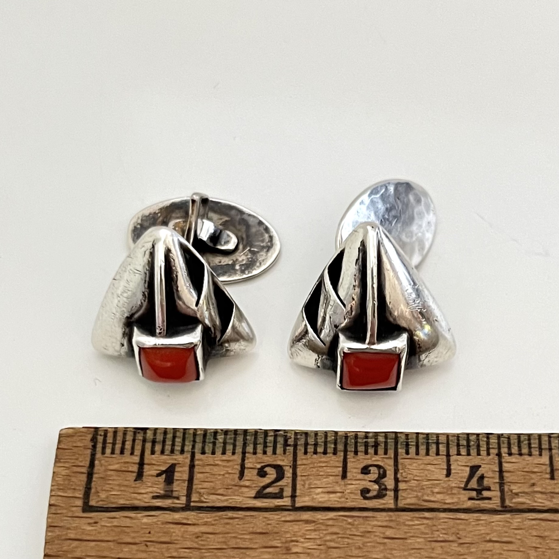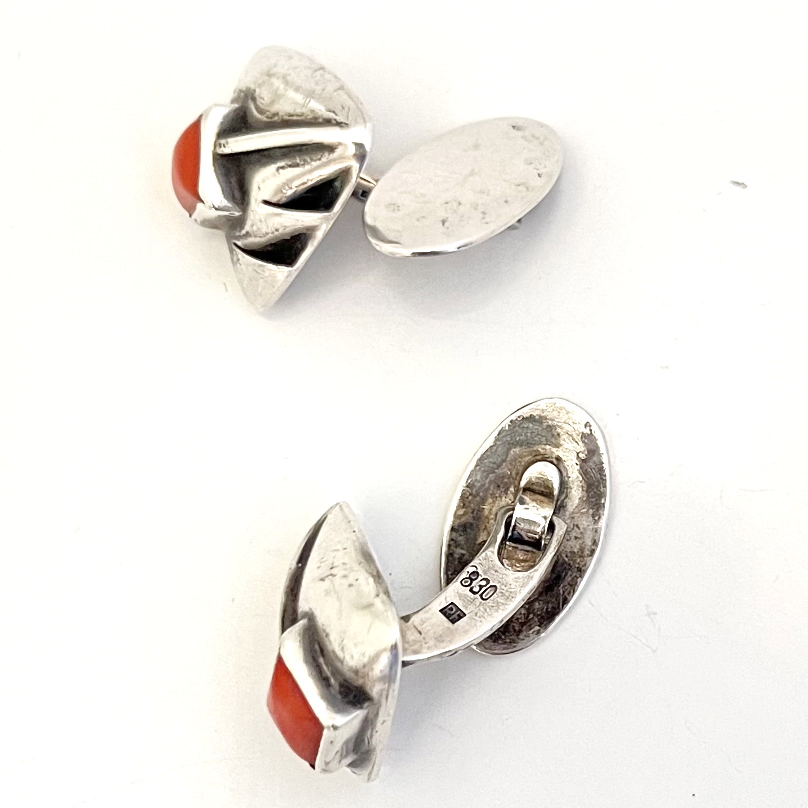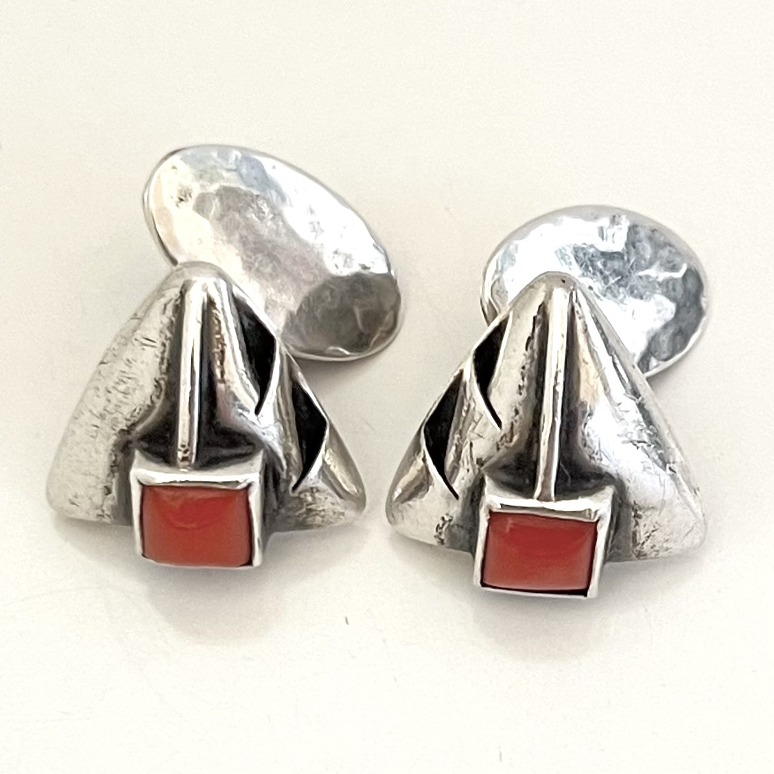 Sehr hübsche Jugendstilmanschettenknöpfe. Handgearbeitet. Der vordere Teil ist mit 900 Handarbeit gestempelt. Der Steg mit 830. Quadratische Korallencabochons.
