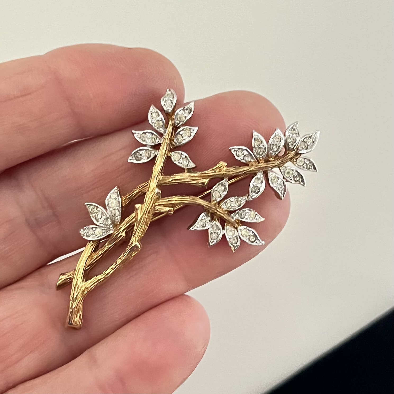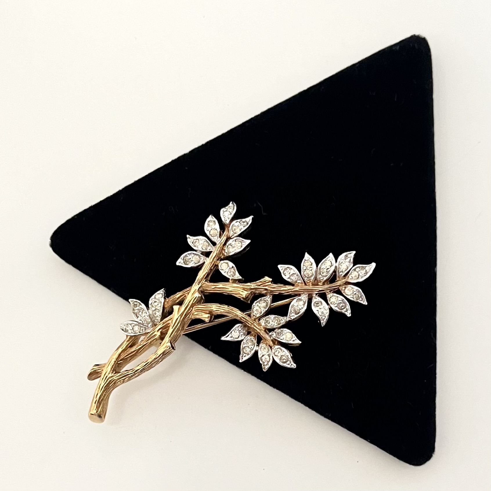 Fein gestaltete, elegante Brosche in Form eines Zweiges. Auf der Rückseite bezeichnet: Panetta. Goldfarbener Metallguss mit feiner Oberflächenstruktur, klare Strassakzente. Sicherheitsverschluß. Guter Erhaltungszustand.