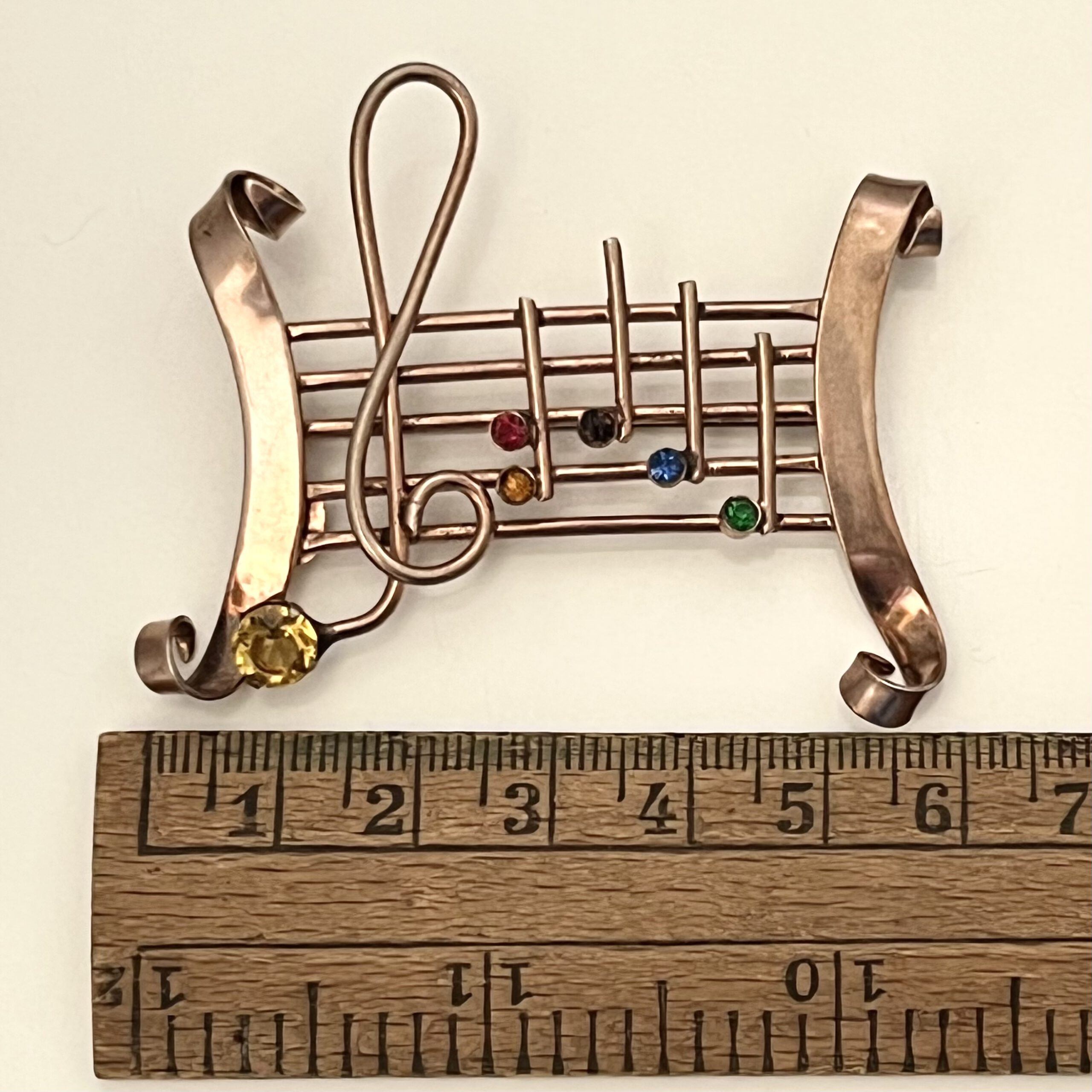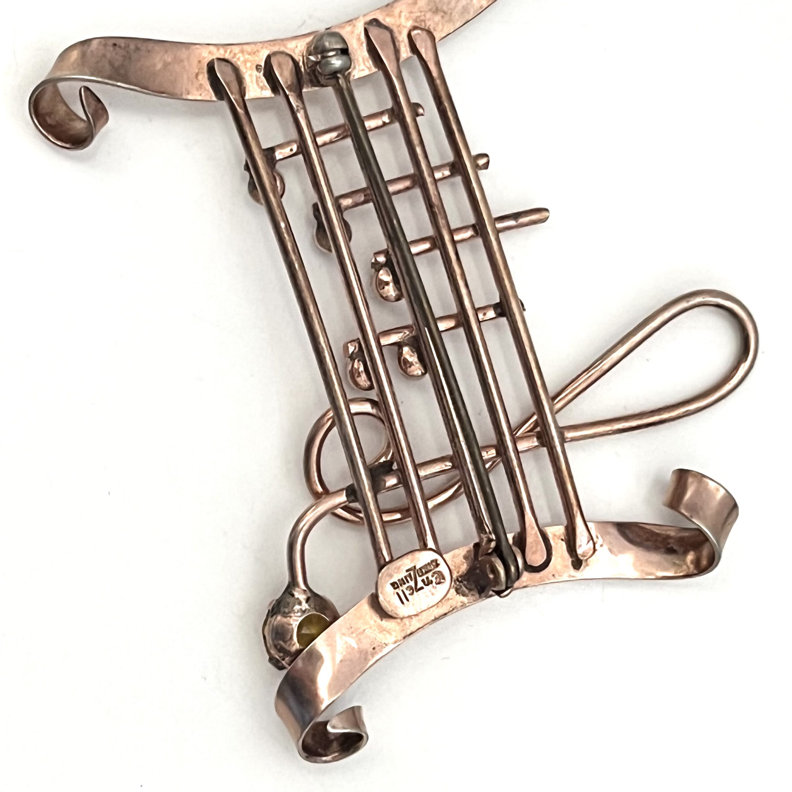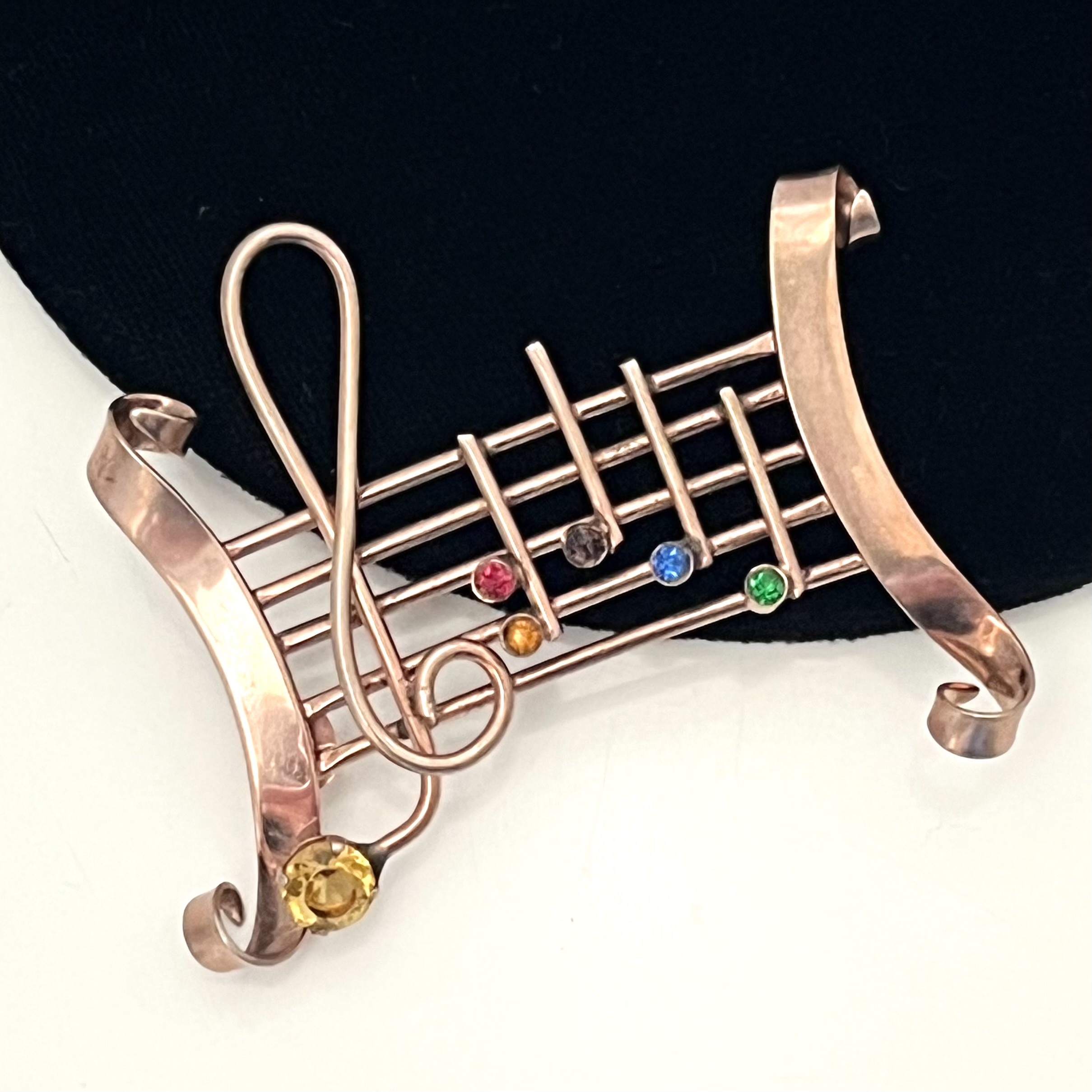 Verspielte Brosche mit Notenschlüssel und Notendekor aus vergoldetem Sterlingsilber. Sicherheitsverschluß. Ausgefallenes Originalstück.
