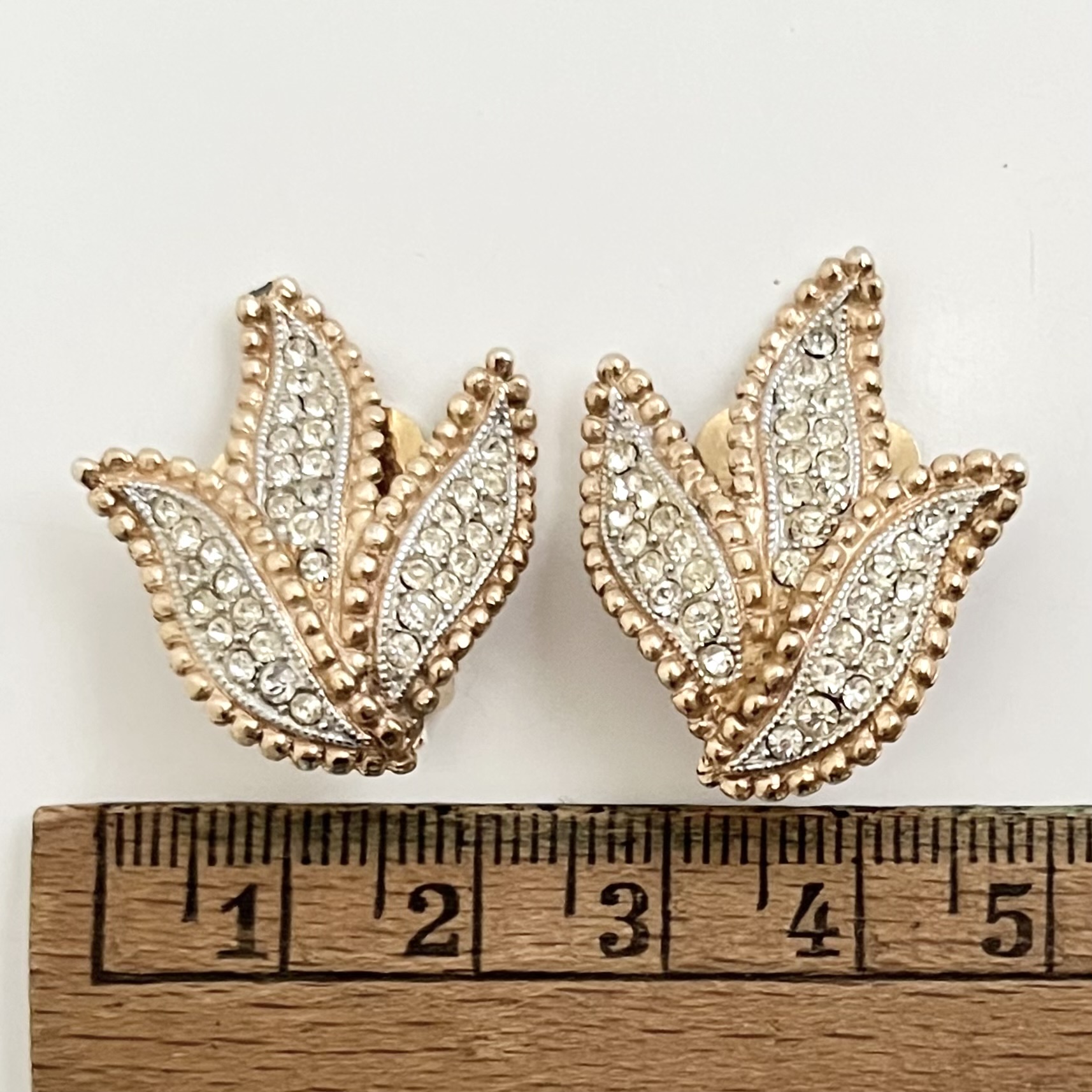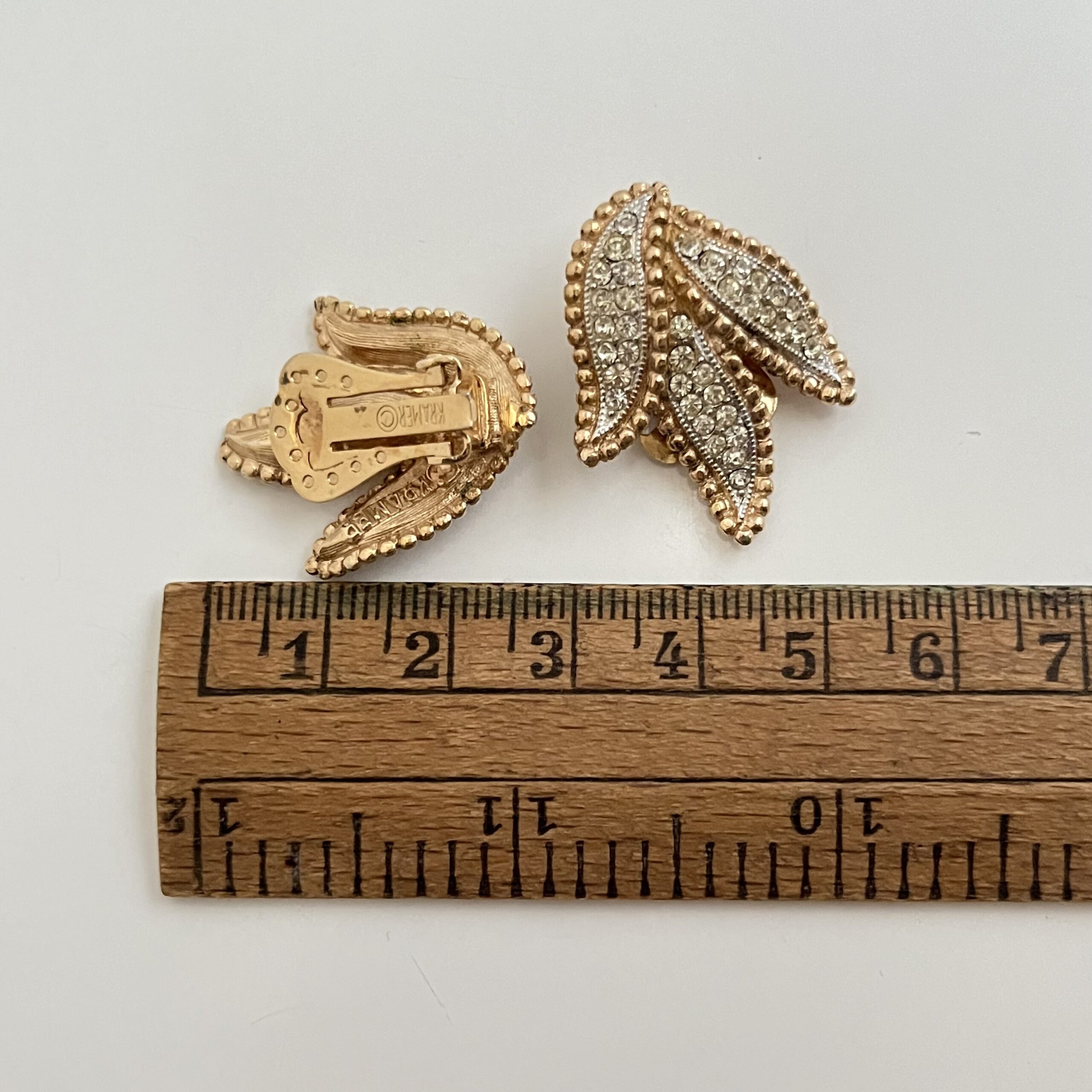 Blattartige Ohrclips von Kramer New York. Matt-goldfarbene Oberfläche, klarer Strass.