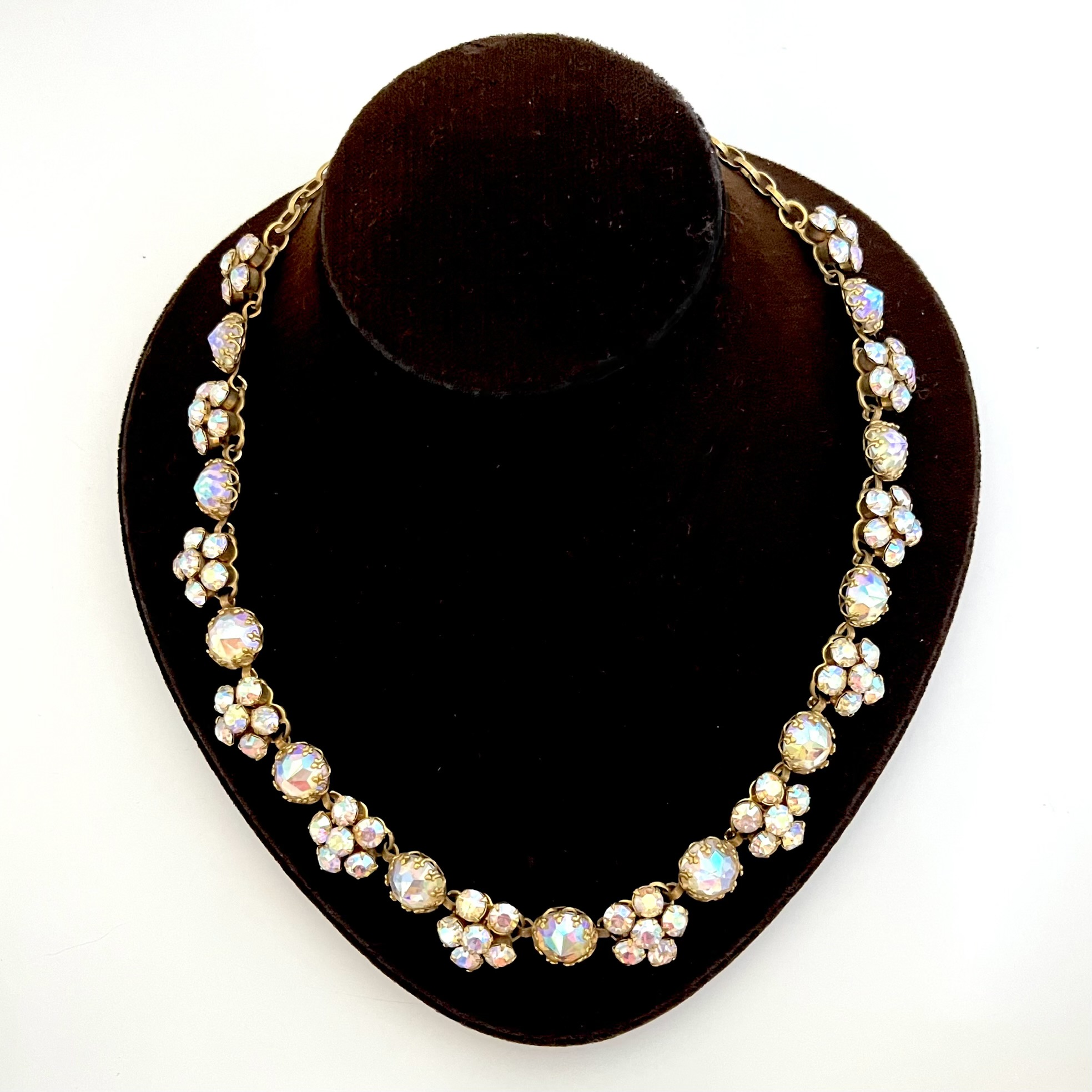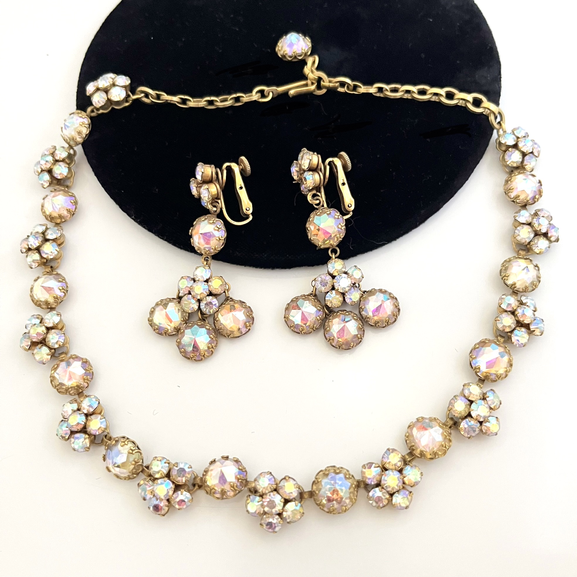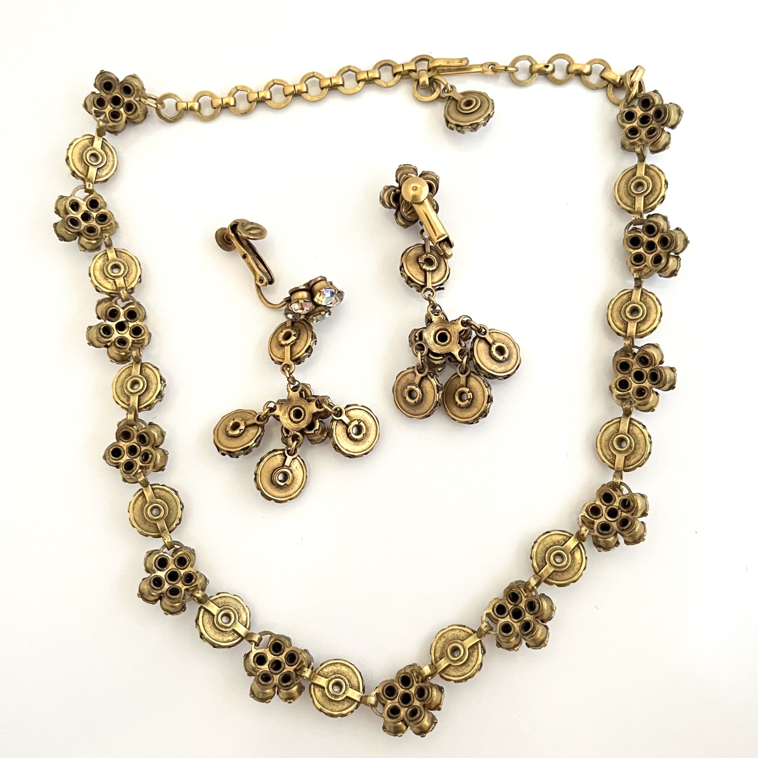 Dekoratives Schmuckset, bestehend aus einem Collier und passenden Ohrhängern, von der amerikanischen Firma Coro. Die Firmensignatur befindet sich auf dem inneren Clip.