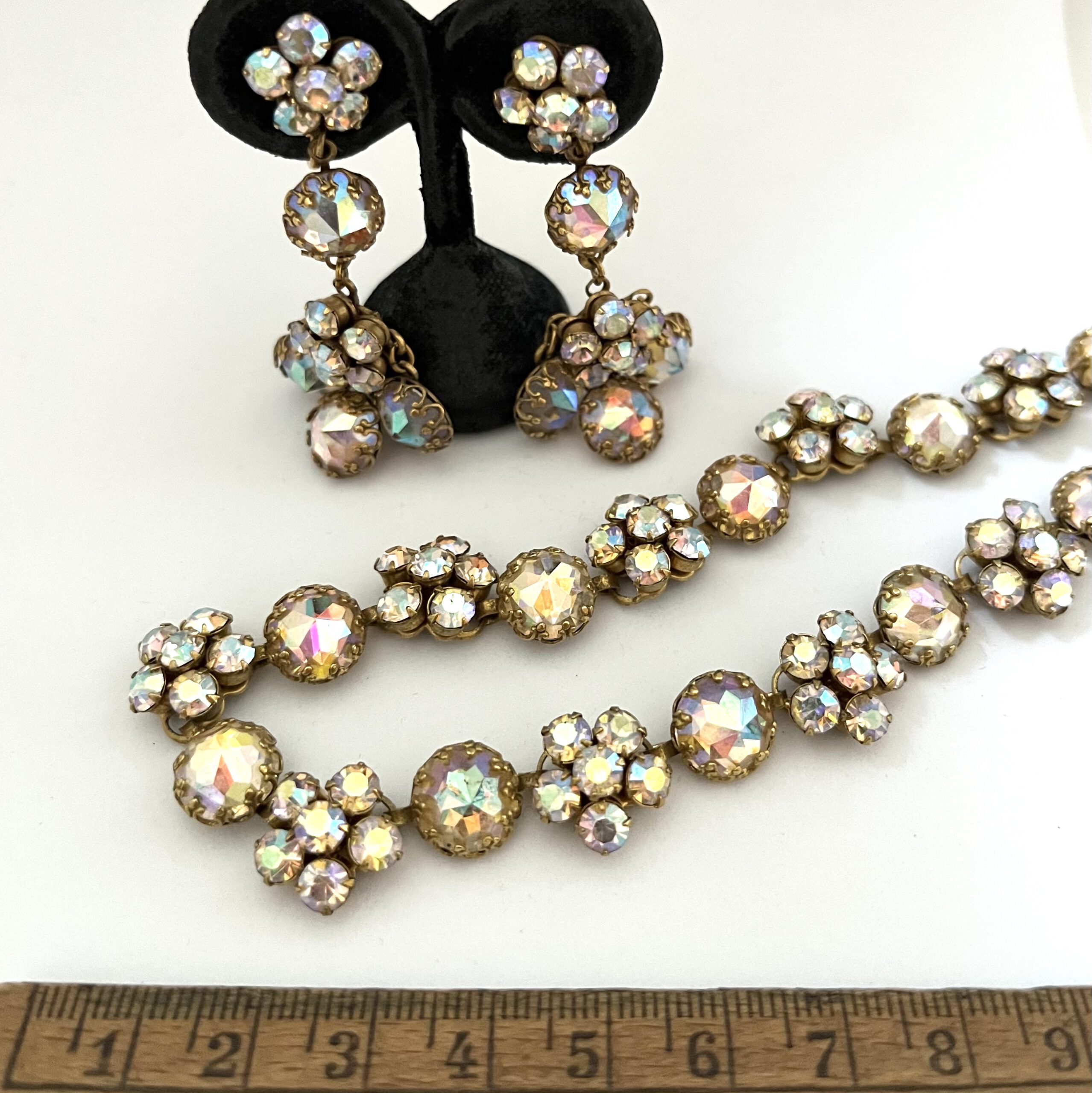 Größe: Ohrclips 5,8 x 2,5 cm – Collier 1,3 x 43 cm Material: Goldfarbene Metallfassung, irisierender Strass Artikelnummer: SE068