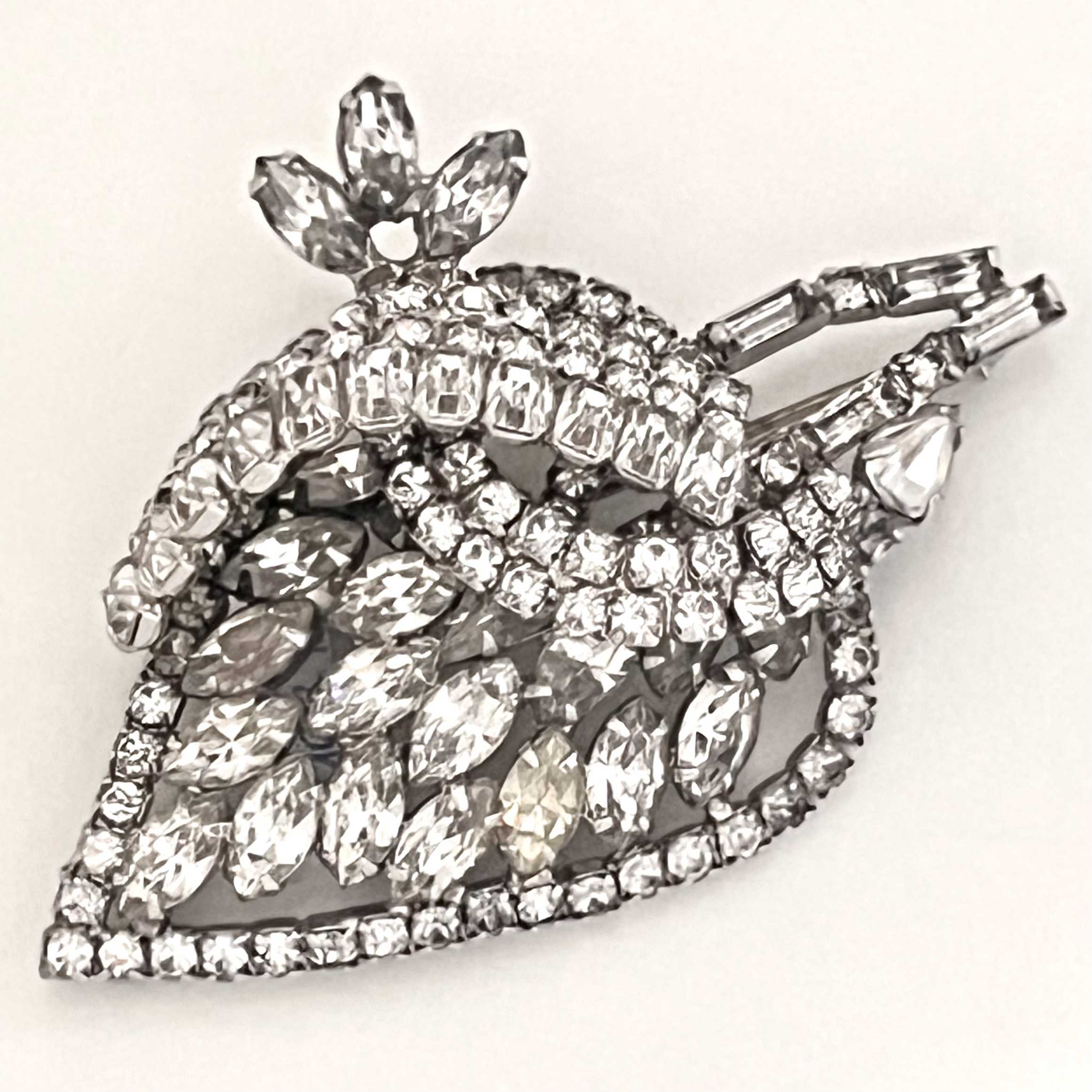 Dekorative Strassbrosche von Kramer of New York. Dreidimensional gestaltet. Sicherheitsverschluß. Eingefasster Strass. Glitzernder Hingucker.