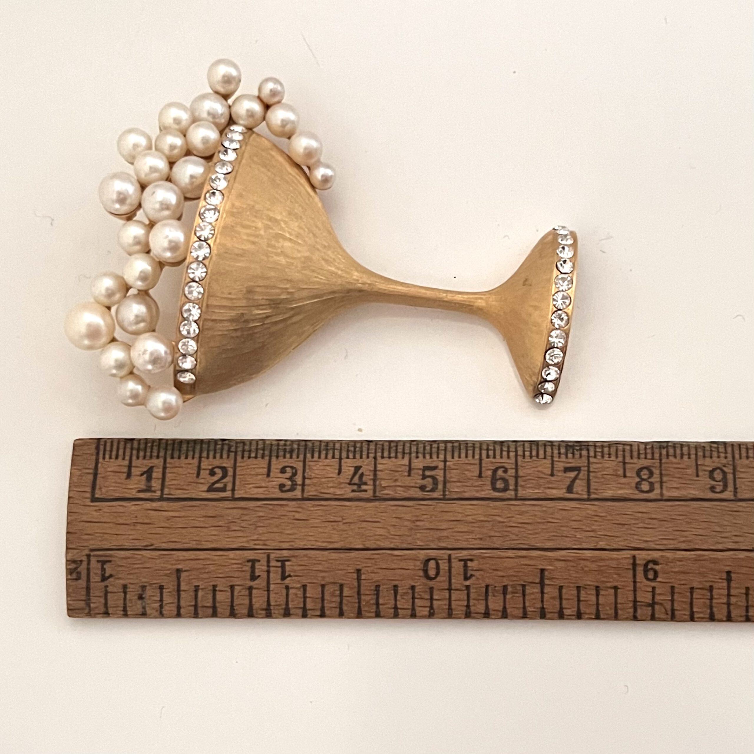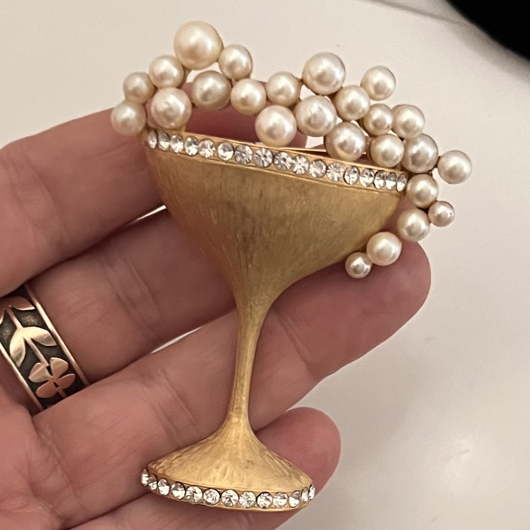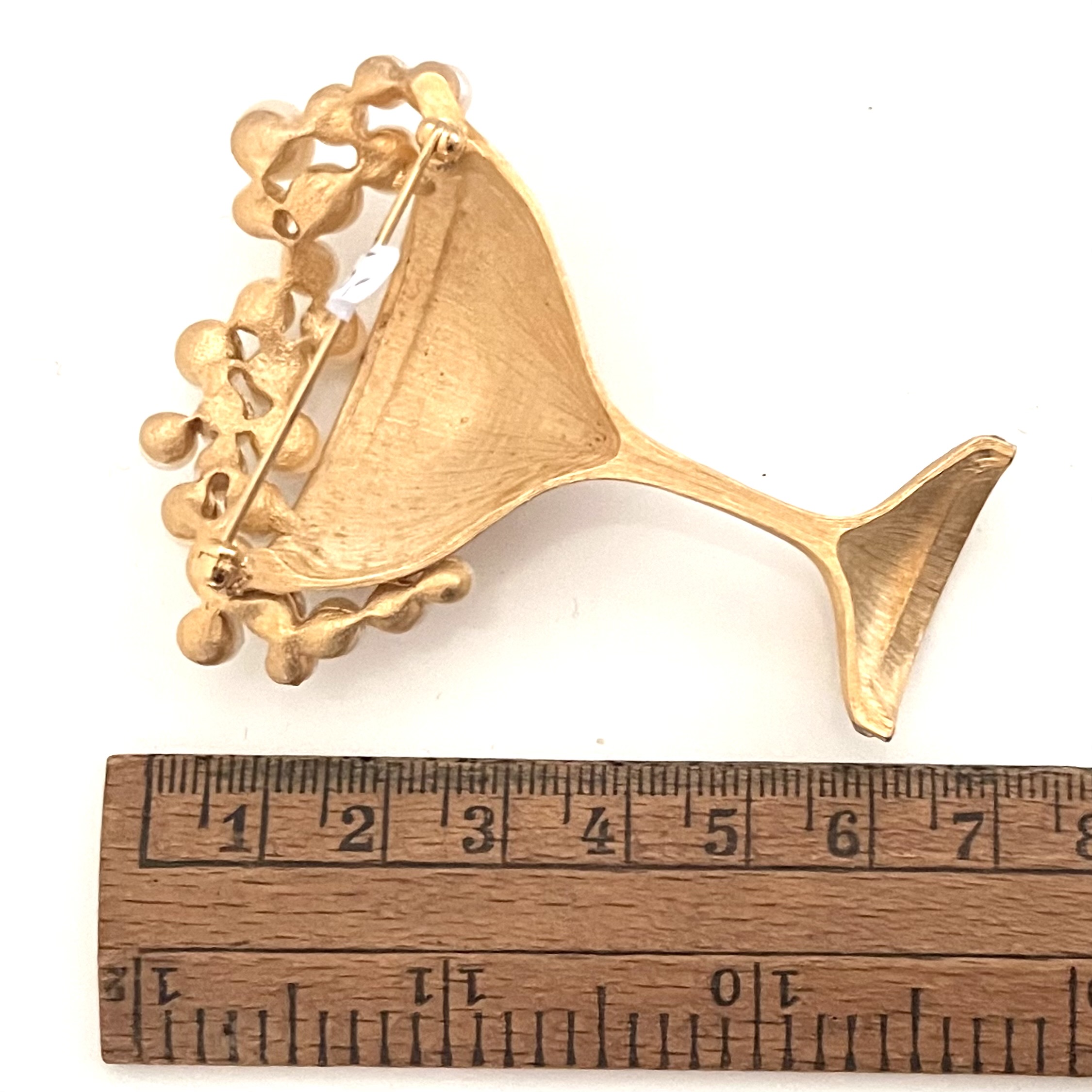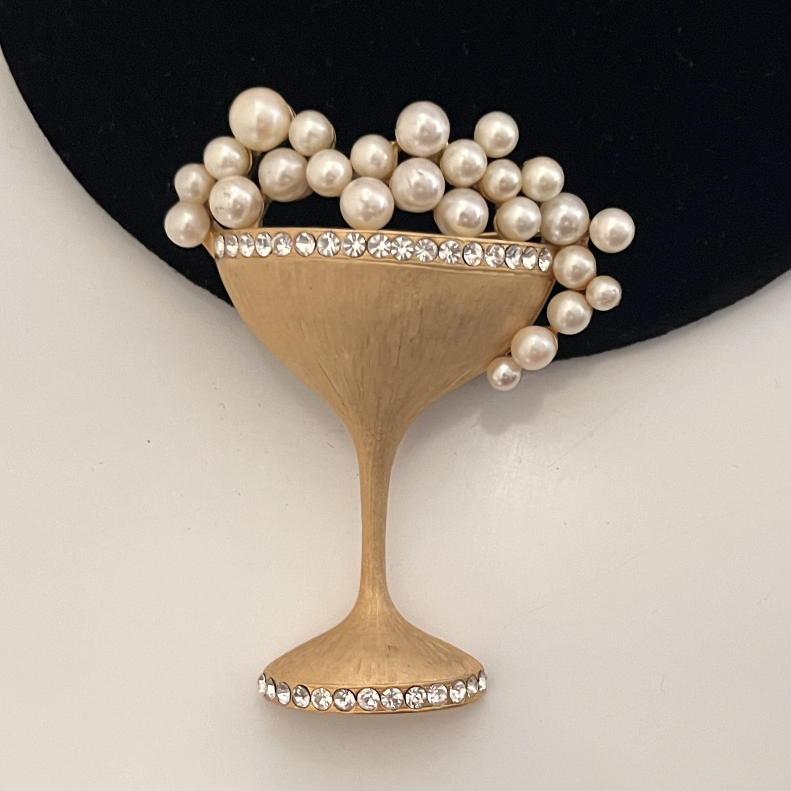 Ausgefallene große Brosche in Form eines überbordenden Cocktailglases. Matt-goldfarbener Metallguss, Kunstperlen und Strass. Sicherheitsverschluß. Cheers!
